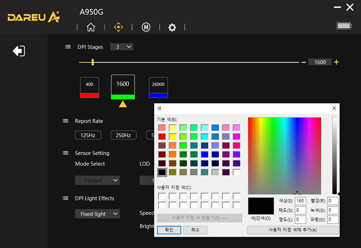 DPI는 기본적으로 5단계로 설정이 되어있지만 사용자에 맞게 2-3단계로 조절할 수도 있고 DPI에 따라 LED 색도 변경이 가능합니다. DPI 단계나 LED를 설정할 수 있다는 점은 좋았지만 DPI 수치는 직접 입력할 수 없고 막대를 움직이거나 +, - 버튼으로 조절을 해야 되는 부분은 아쉽더군요. (50단계로 증가와 감소가 됩니다.)