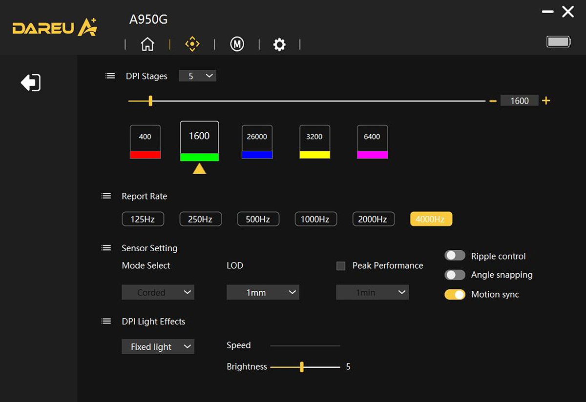 A950G의 가장 큰 특징인 폴링레이트(Report Rate)를 4,000Hz까지 설정할 수 있습니다. 게이밍 마우스들의 경우 1,000Hz가 일반적인데 이와 비교를 해보니 마우스가 조금 더 끌리거나 무겁다는 느낌이었습니다. 아주 작은 차이이긴 하지만 이런 느낌이 정확한 데이터가 아니라 단순 플라시보 효과일 수도 있습니다. 사실 일반 사용자가 1ms와 0.25ms를 구분한다는 건 거의 불가능하다고 생각하거든요. ^^)