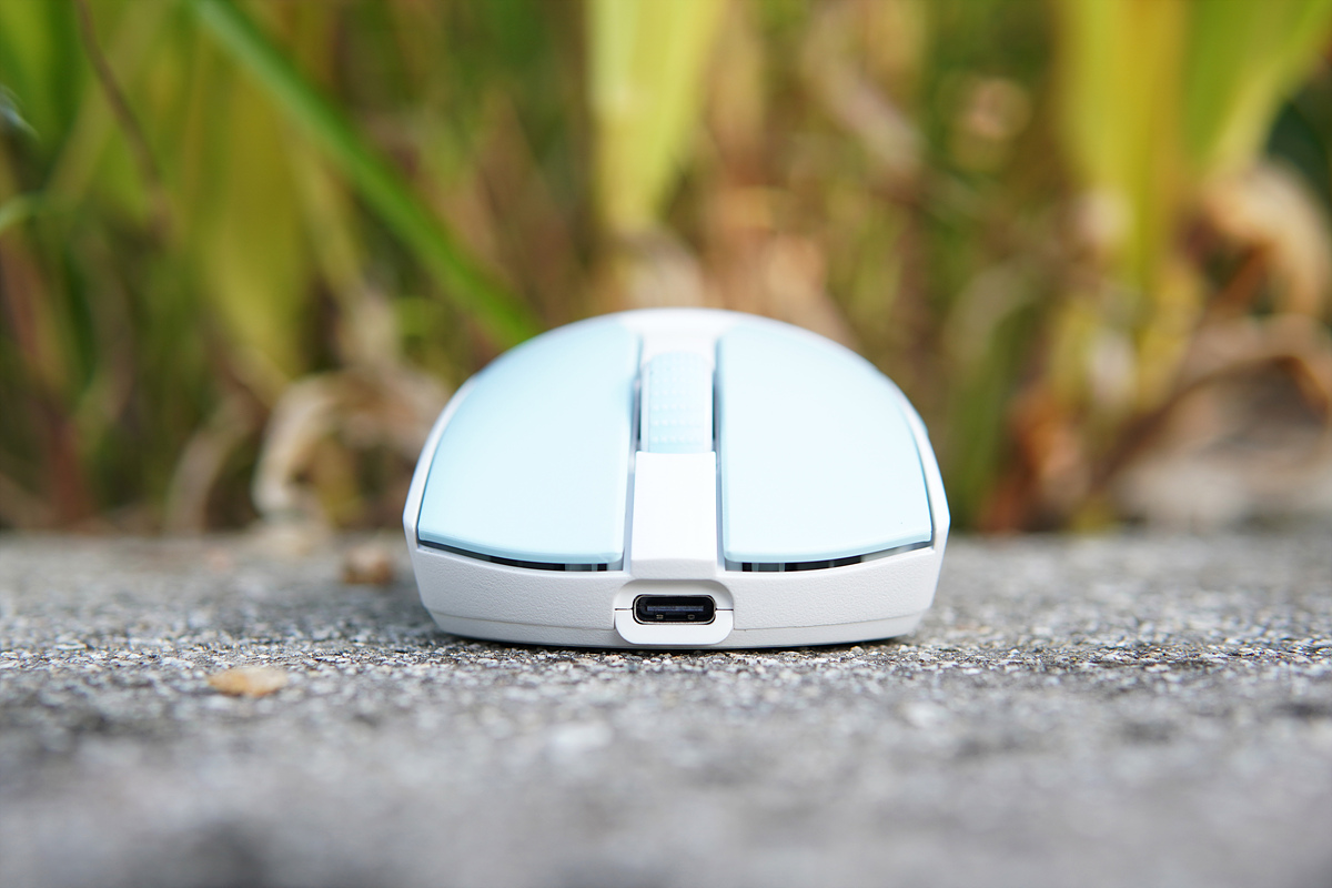 A950과 같이 좌우 대칭형 디자인을 하고 있으며 앞쪽으로는 배터리를 충전할 수 있는 Type-C 포트가 있습니다. 간혹 충전 포트가 안쪽으로 들어가 있어서 전용 케이블을 사용해야 되는 마우스들이 있는데 A950G는 쉘에 바로 붙어 있어서 케이블을 가리지 않고 충전할 수 있습니다.