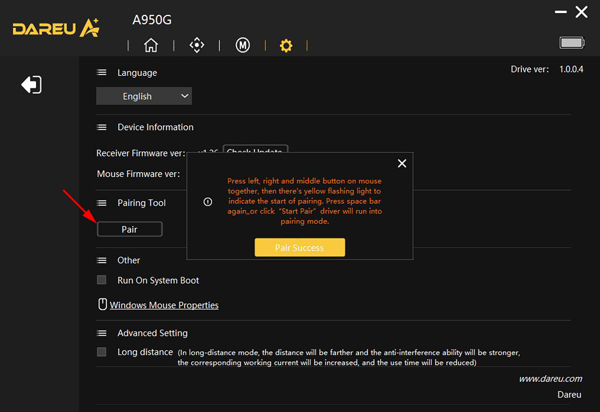 수신기로 제품을 다시 연결하려면 Pair을 클릭한 뒤 마우스의 좌, 우, 휠 버튼을 같이 눌러야 합니다.