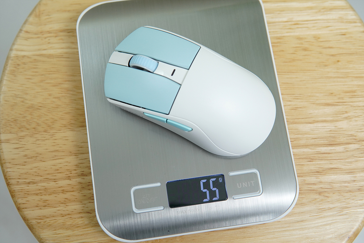 무게는 스펙과 같은 55g으로 측정이 되었습니다. AA 배터리를 사용하는 마우스에서 배터리를 뺀 느낌과 비슷한 편으로 실제로 잡아보면 다른 마우스와 확실하게 구별이 됩니다.