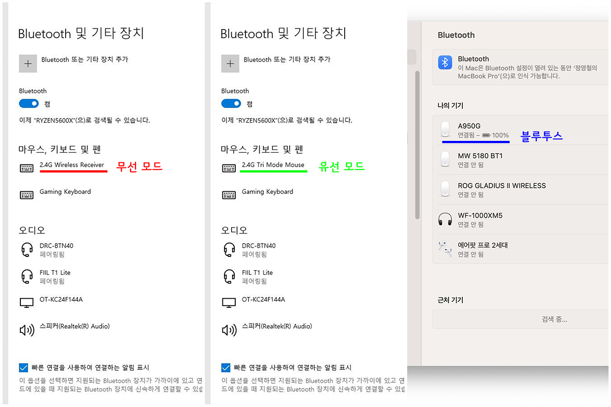 무선, 유선, 블루투스 모드별로 마우스가 인식되는 이름이 달라집니다.