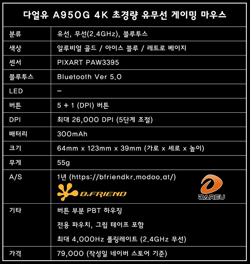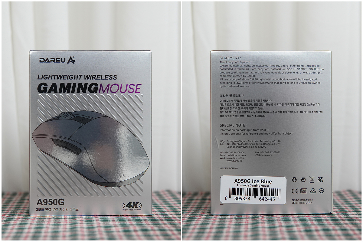 게이밍 마우스에서 가장 중요한 부분 중 하나인 센서는 상향평준화가 이루어져 더 이상 크게 주목을 받거나 차별(?)이나 구분을 하지 않게 되었습니다. 그래서인지 제조사들은 센서보다 쉘의 디자인과 무게, 연결 방식이나 부가 기능들에 대해 더욱 집중을 하고 있죠. 다양한 게이밍 기어를 공급하고 있는 다얼유(DAREU)에서도 전용 충전 독을 이용한 게이밍 마우스들을 출시해 왔는데 이번에 소개하는 A950G는 기존 마우스들과는 다르게 4k(4,000Hz) 폴링레이트와 55g의 가벼운 무게를 가지고 있습니다. (쉘의 크기는 거의 변화가 없습니다.)