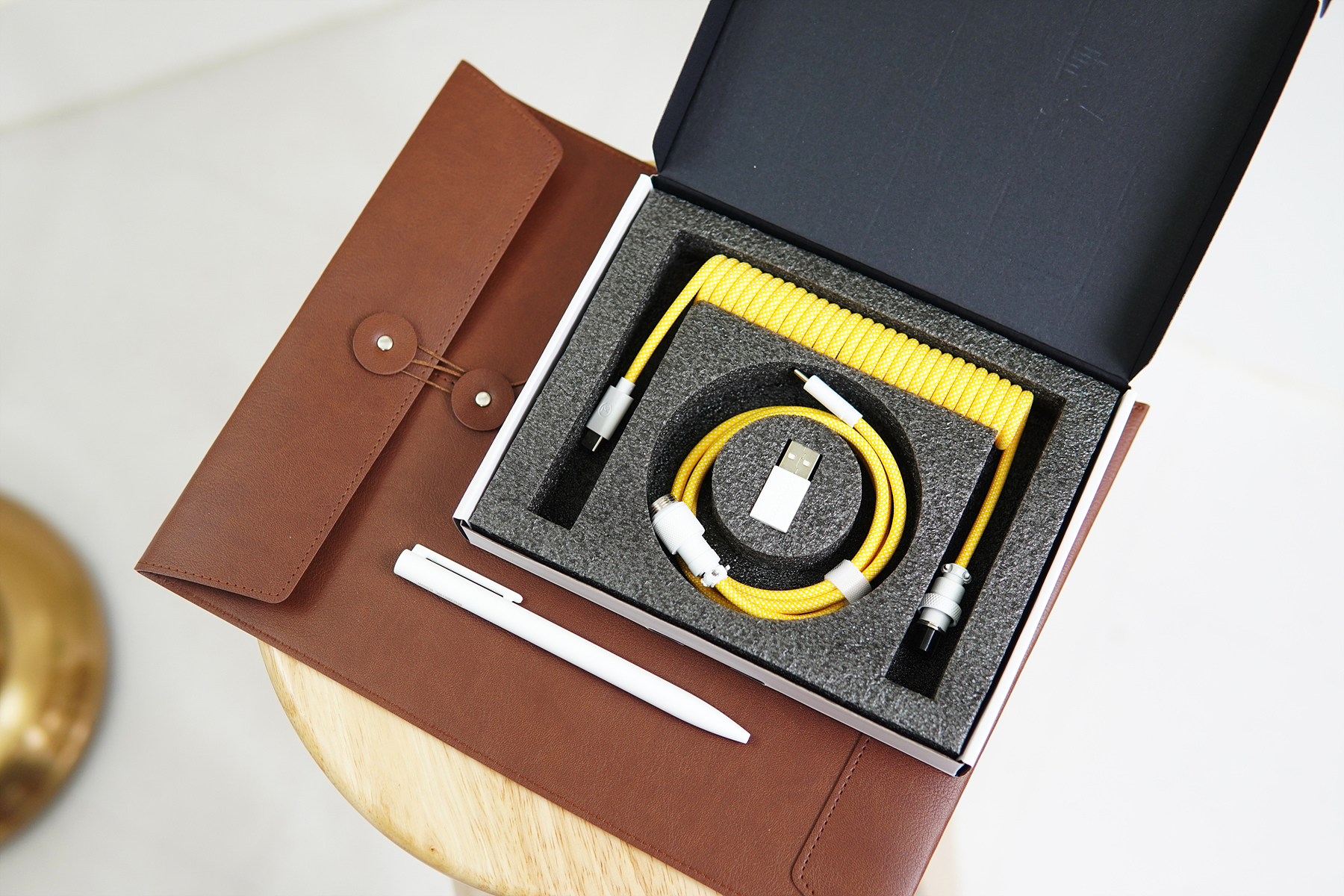 GIFT 세트는 항공 케이블이라고 부르는 코일 케이블, 볼펜, 가죽 파우치로 구성되어 있습니다.