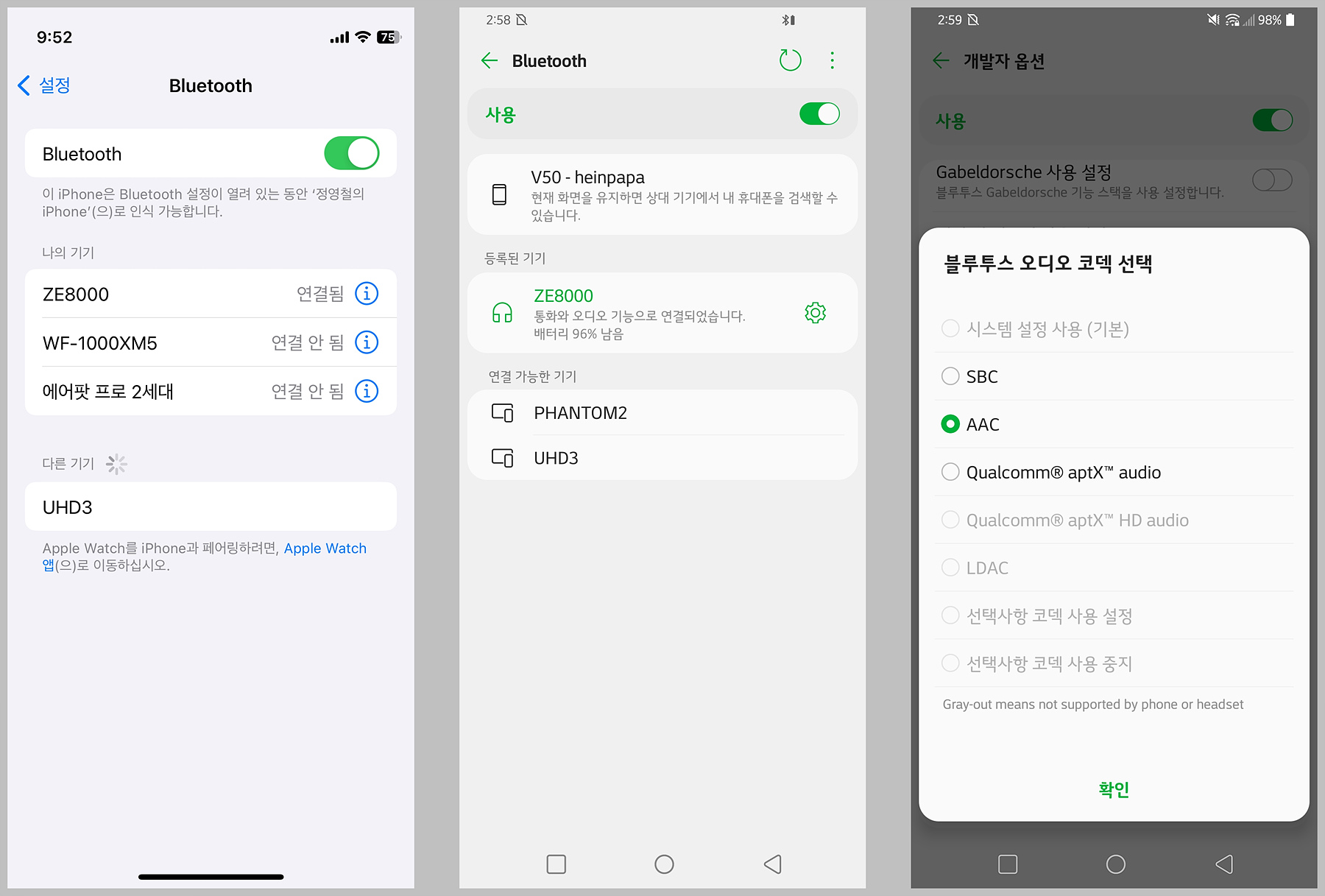 ZE8000은 퀄컴의 aptX Adapive를 사용할 수 있지만 국내에는 이를 지원하는 스마트폰은 거의 없어서 하위호환인 aptX를 사용할 수 있습니다. 별도의 수신기를 사용하면 해당 코덱은 사용할 수 있습니다.