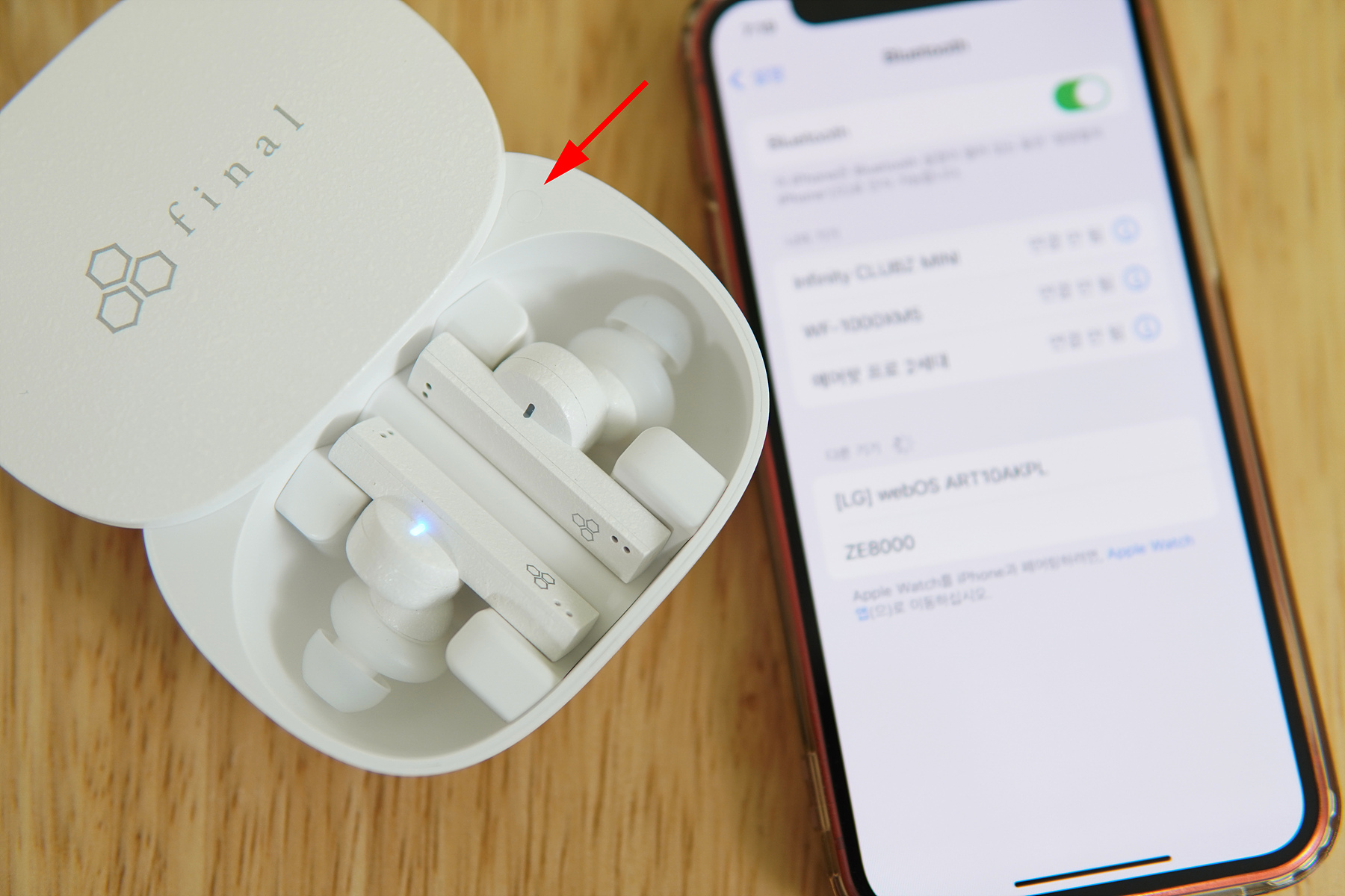 케이스를 열면 자동으로 페어링 모드로 진입하며 LED는 파랑 / 빨강으로 바뀌며 현재 상태를 알려줍니다. 케이스를 열면 한시 방향(화살표)에는 이어버드를 초기화할 수 있는 버튼이 있습니다.