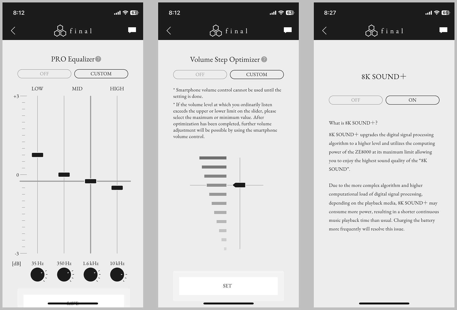EQ는 별도의 프리셋은 없고 4 밴드로 사용자가 원하는 세팅으로 설정할 수 있으며 볼륨 스텝 최적화를 통해 이어폰의 볼륨을 더 작게 줄이거나 반대로 올릴 수 있습니다. ZE8000의 기본 출력은 다른 이어폰들보다 조금 더 큰 편이라 딱히 이 항목을 조절할 필요는 없을 거 같네요.