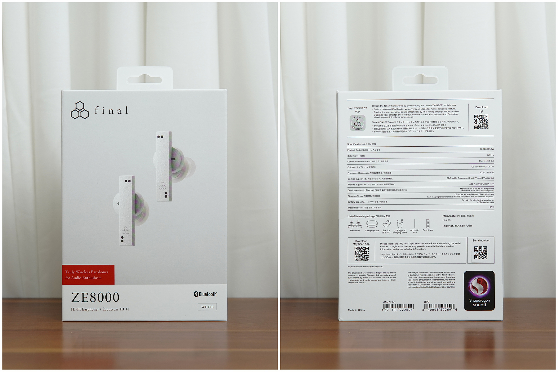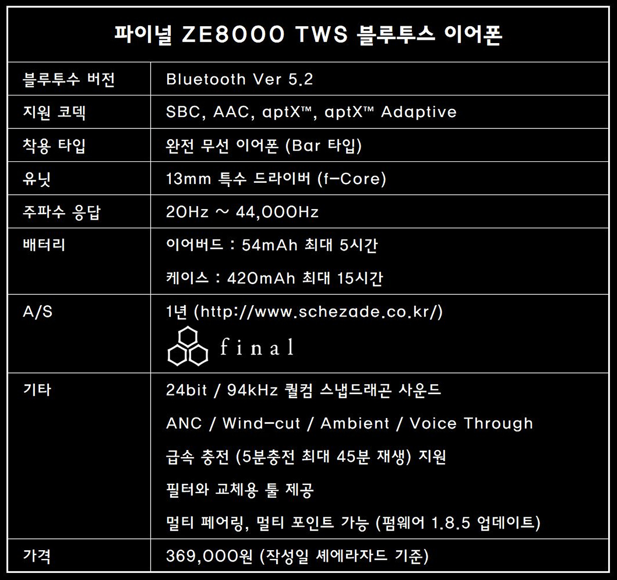 일본의 프리미엄 음향기기인 파이널의 유선 헤드폰과 이어폰은 시장에서 상당히 좋은 반응을 받고 있는데 시대적인 흐름을 따라서 다른 브랜드들처럼 TWS인 무선 제품들도 다루기 시작해서 영역을 점차 넓혀가고 있습니다. 이번에 소개하는 ZE8000은 파이널의 플래그쉽 TWS 제품으로 그에 맞는 여러 가지 스펙과 기능들을 가지고 있습니다. 특히나 퀄컴의 스냅드래곤을 사용한 aptX Adaptive 코덱으로 24bit / 96kHz의 고음질로 음악을 감상할 수 있죠. (국내에서는 이를 활용할 수 있는 스마트기기가 다소 제한적인 게 좀 아쉽네요.) 개인적으로 파이널 E 시리즈 이어폰을 좋아하는 편이라 ZE8000의 소리가 어떨지 상당히 기대가 되네요.