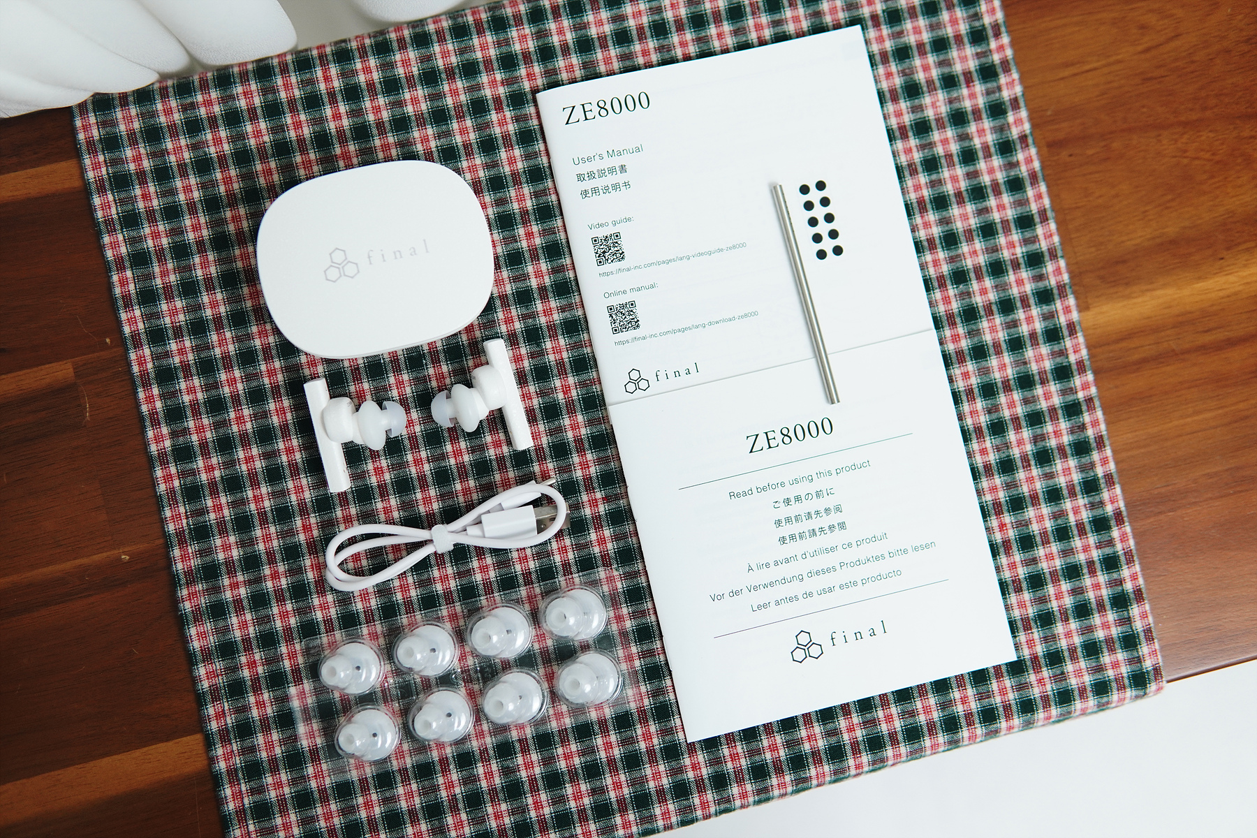 충전용 케이스, 이어버드 한쌍. 충전용 케이블(Type-C). 추가 이어팁 4쌍과 설명서 그리고 조금은 특별한 구성품이 추가되었습니다. 설명서는 영어, 일본어, 중국어를 지원하지만 한글은 빠져있네요.