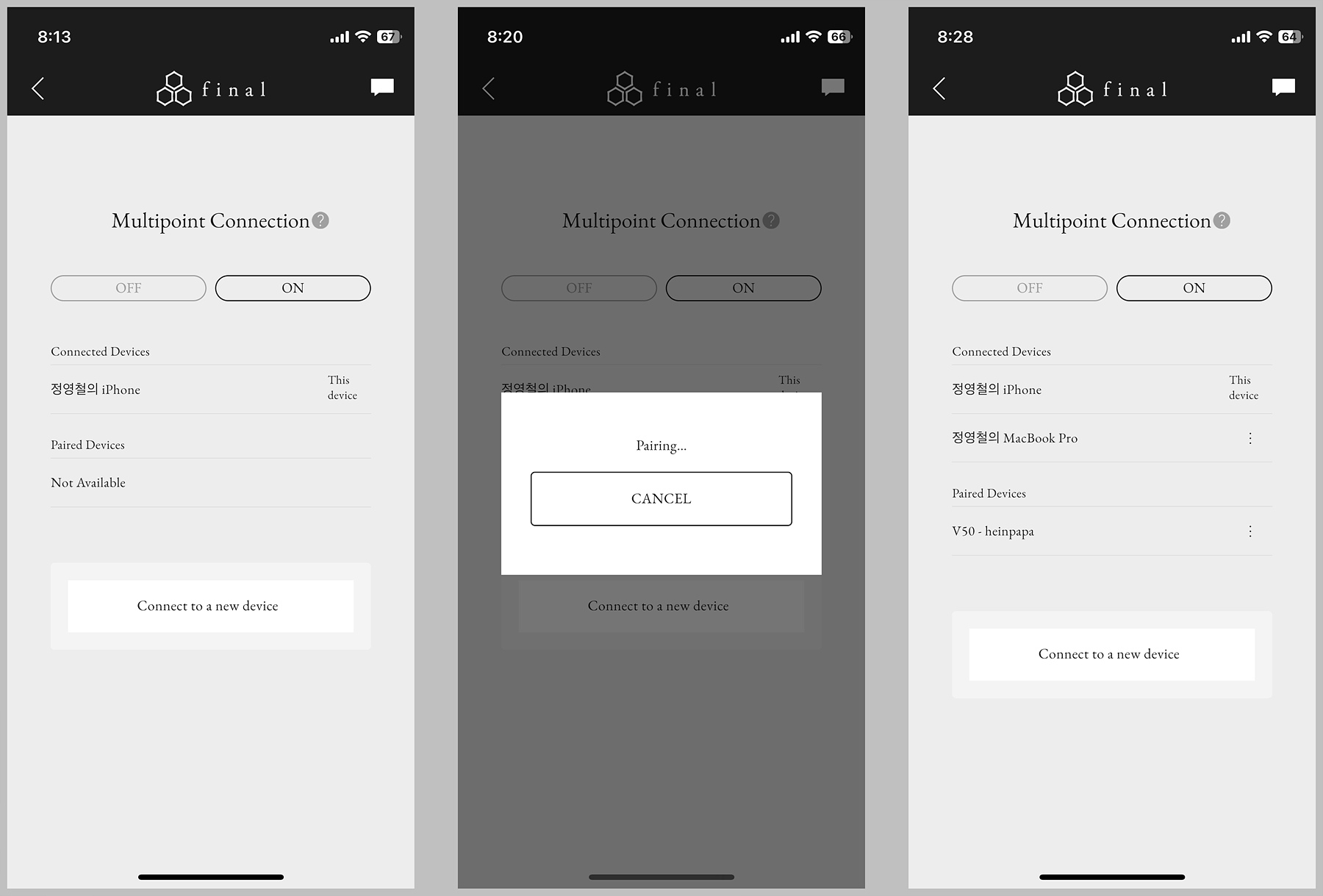 멀티포인트 커넥션 항목에서는 다른 기기와 연결할 수 있도록 페어링 모드로 진입할 수 있으며 여러 가지 기기들을 연결해서 멀티 페어링 & 멀티 포인트 기능을 사용할 수 있습니다.