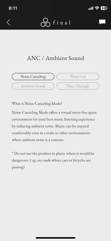 노이즈 캔슬링 / 윈드 컷 / 앰비언트 / 보이스 쓰루 기능을 사용할 수 있는데 노이즈 캔슬링이 되는 범위나 강도는 그리 강한 편이 아니라 제품의 가격을 생각한다면 이 부분 역시 아쉽게 느껴졌습니다. 앰비언트의 경우 주변 소리의 왜곡은 적은 부분은 좋았으며 위에서 언급한 것처럼 마이크의 위치와 구조상 바람 소리가 많이 들어가는 편이라 바람이 많은 곳에서는 윈드 컷 모드를 사용하는 게 좋았습니다.