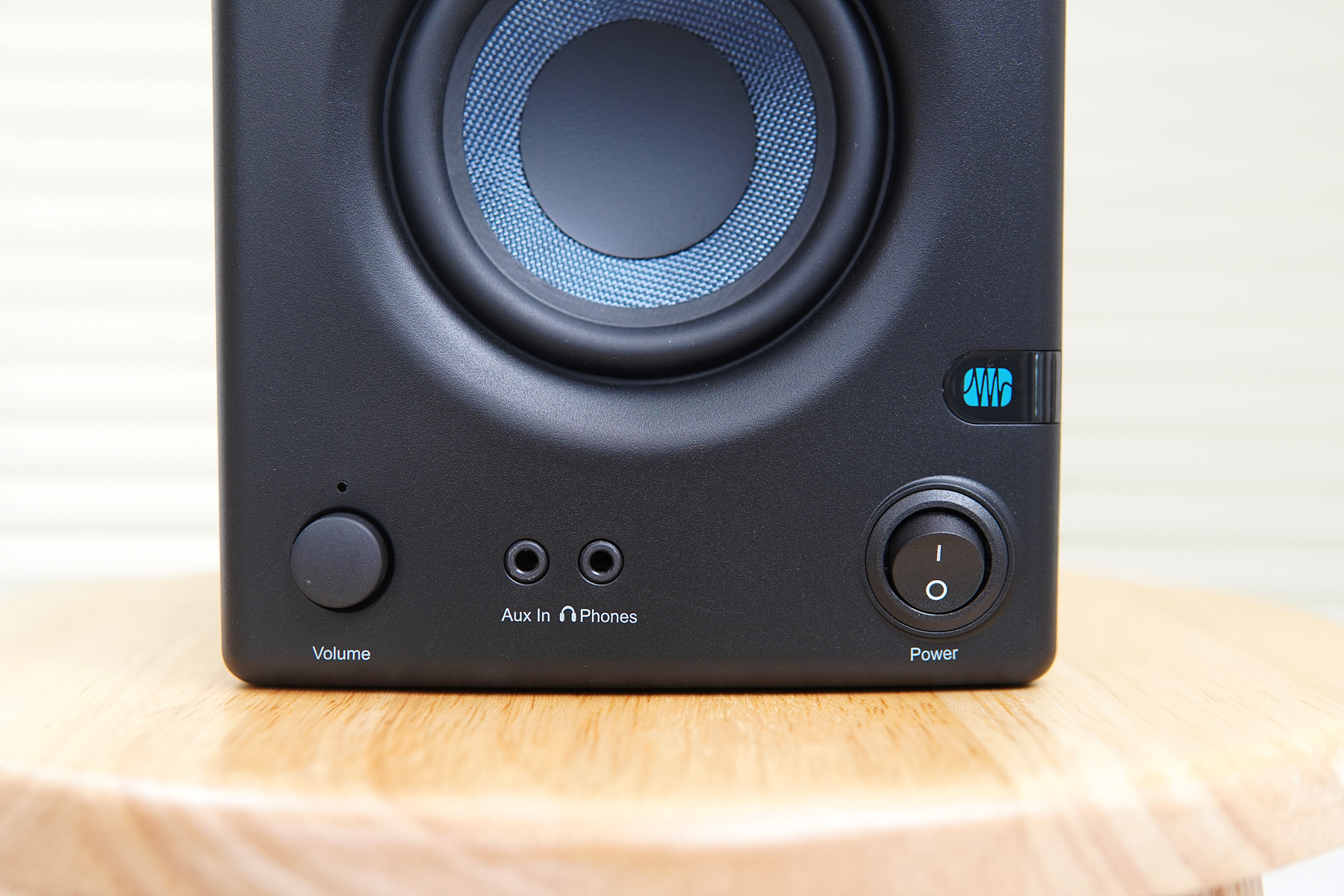 Eris 라인업은 다른 제품들과는 다르게 액티브 스피커가 오른쪽이 아닌 왼쪽으로 되어있습니다. 케이블 연결에 따라 좌우를 바꿀 수도 있지만 기본적으로 이 부분은 꽤나 독특하다고 할 수 있습니다. 앞쪽에는 별도의 전원 스위치가 있으며 왼쪽으로 볼륨 조절 노브와 AUX 입력, 3.5mm 이어폰 출력 단자가 있습니다. Gen2에서 달라진 점은 볼륨 조절 노브의 위치를 확인하기가 쉬워졌으며 전원 LED가 바(bar) 형태로 우퍼 아래에 좀 더 크게 배치되었습니다.