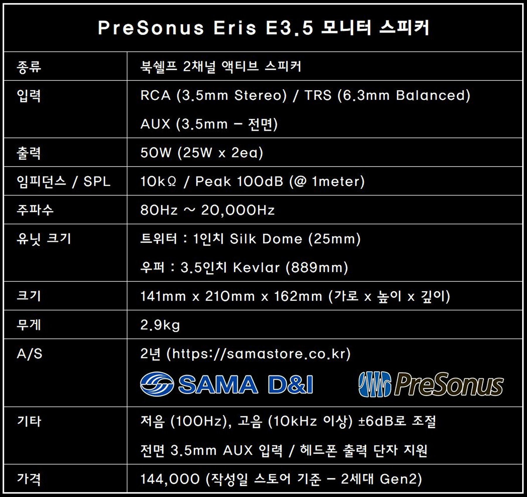 프리소너스 Eris E3.5를 전문가용 모니터 스피커라고 하기에는 분명 부족한 부분이 있지만 10만 원 초반대의 가격에 디자인이나 기능 그리고 소리까지 모두 따져보면 높은 점수를 받을만한 제품이었습니다. 특히나 영상 작업을 하거나 데스크파이를 입문하려는 분들에게 잘 맞을 거라 생각합니다.