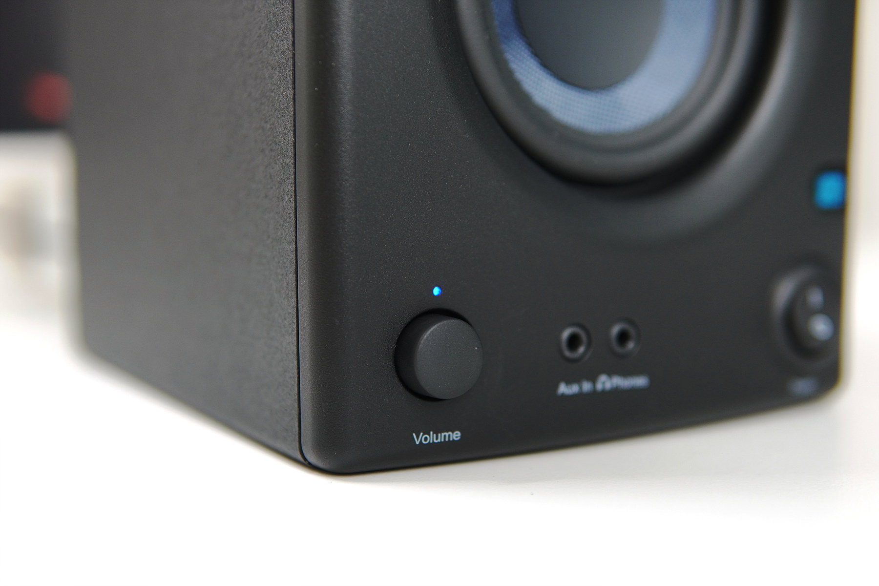 Eris 라인업은 다른 제품들과는 다르게 액티브 스피커가 오른쪽이 아닌 왼쪽으로 되어있습니다. 케이블 연결에 따라 좌우를 바꿀 수도 있지만 기본적으로 이 부분은 꽤나 독특하다고 할 수 있습니다. 앞쪽에는 별도의 전원 스위치가 있으며 왼쪽으로 볼륨 조절 노브와 AUX 입력, 3.5mm 이어폰 출력 단자가 있습니다. Gen2에서 달라진 점은 볼륨 조절 노브의 위치를 확인하기가 쉬워졌으며 전원 LED가 바(bar) 형태로 우퍼 아래에 좀 더 크게 배치되었습니다.