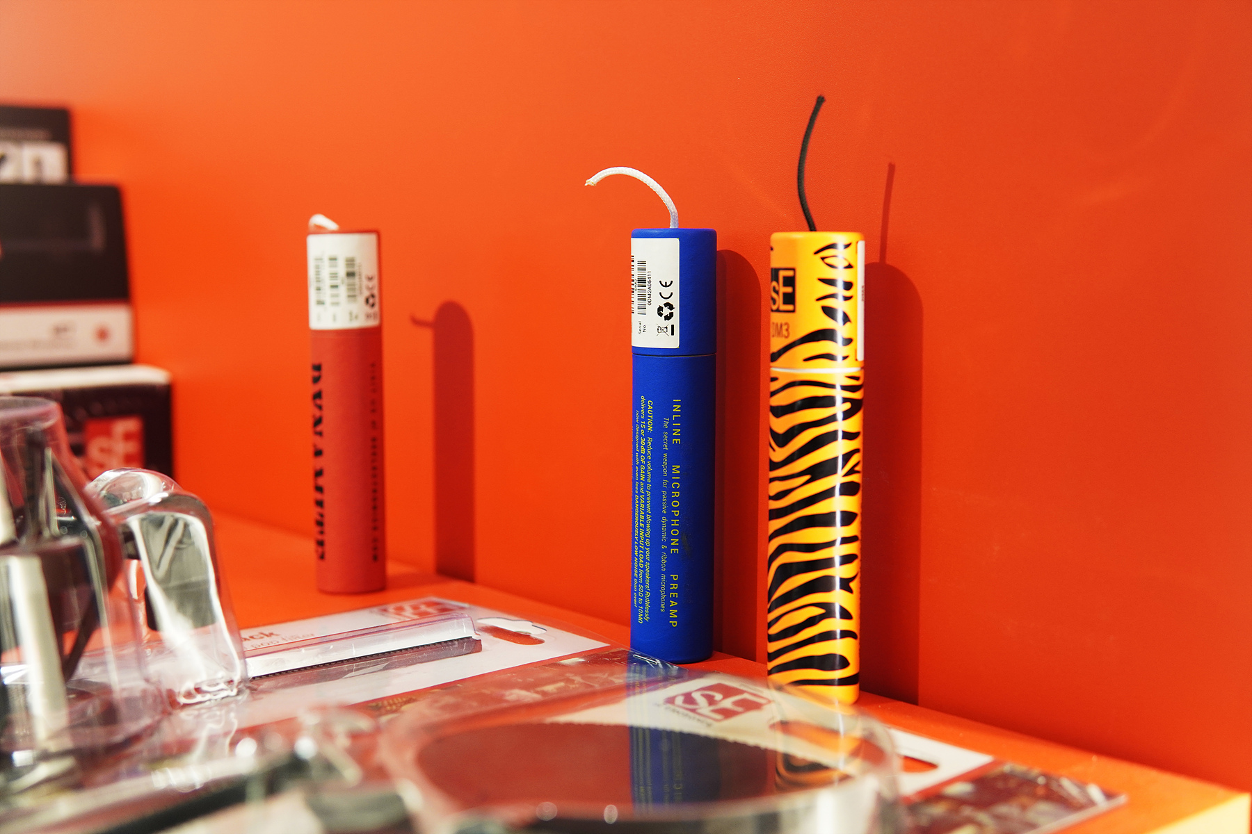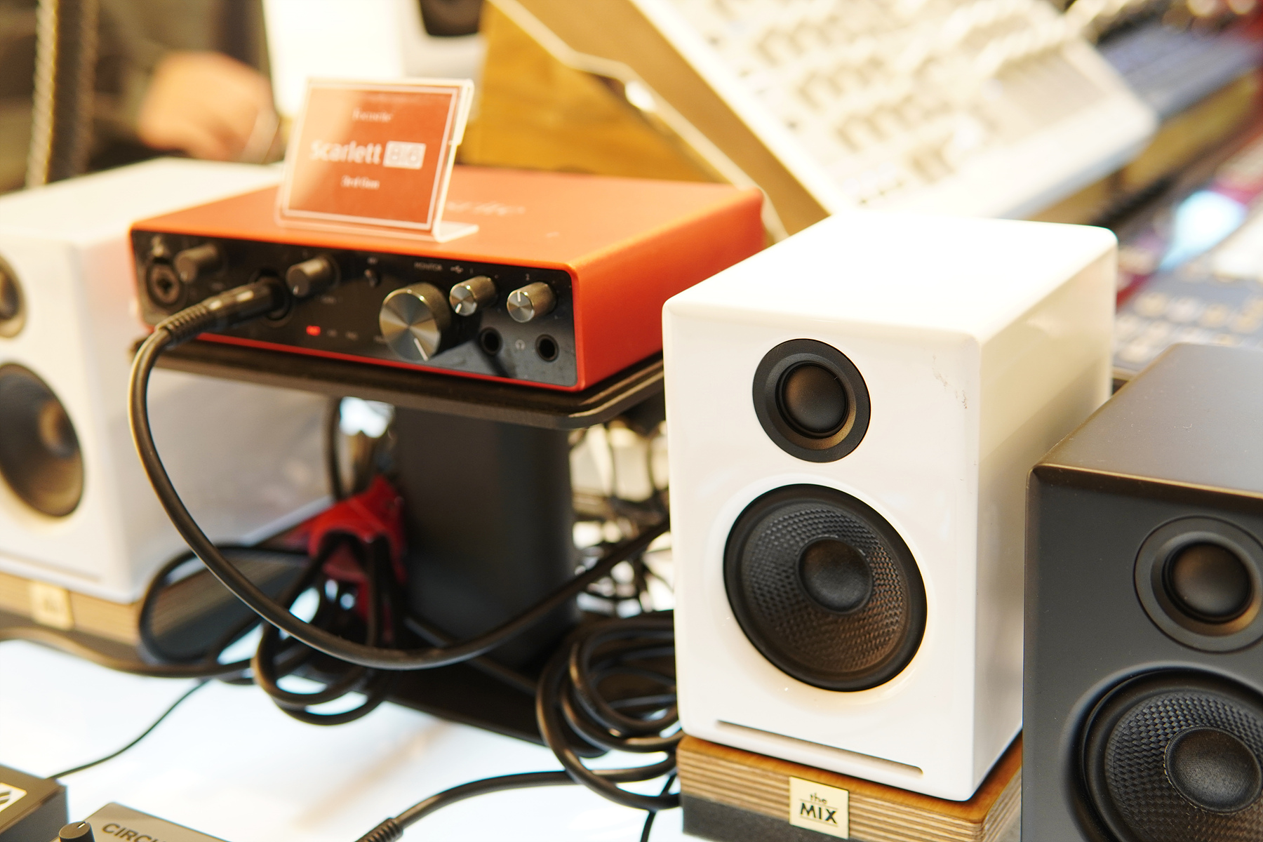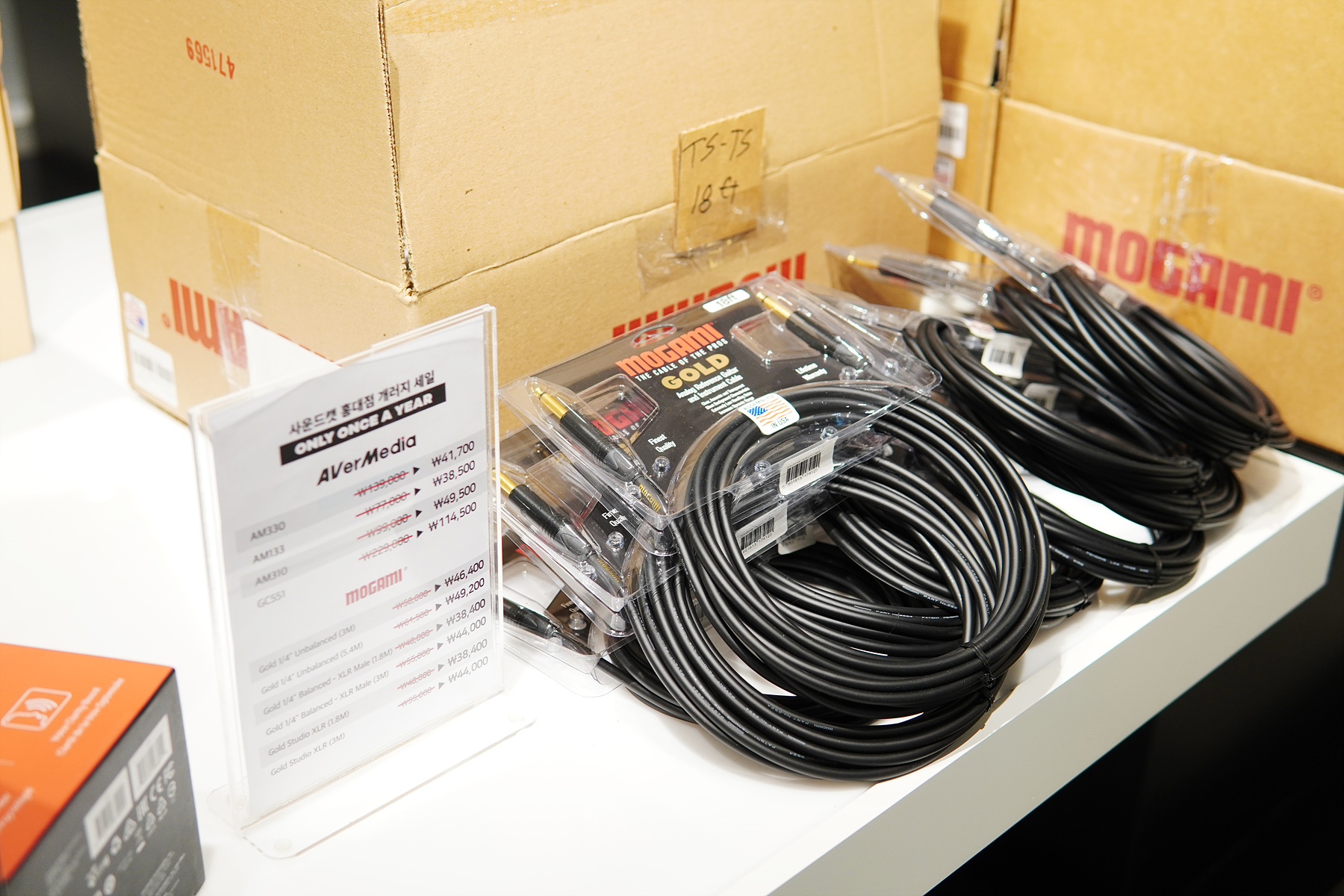 계단을 올라가서 가장 먼저 보이는 오른쪽 부스에는 레코딩(녹음)과 관련된 여러 가지 장비들(마이크, 오인페, 헤드폰등)의 진열과 직접 체험을 할 수 있도록 준비가 되어 있습니다.