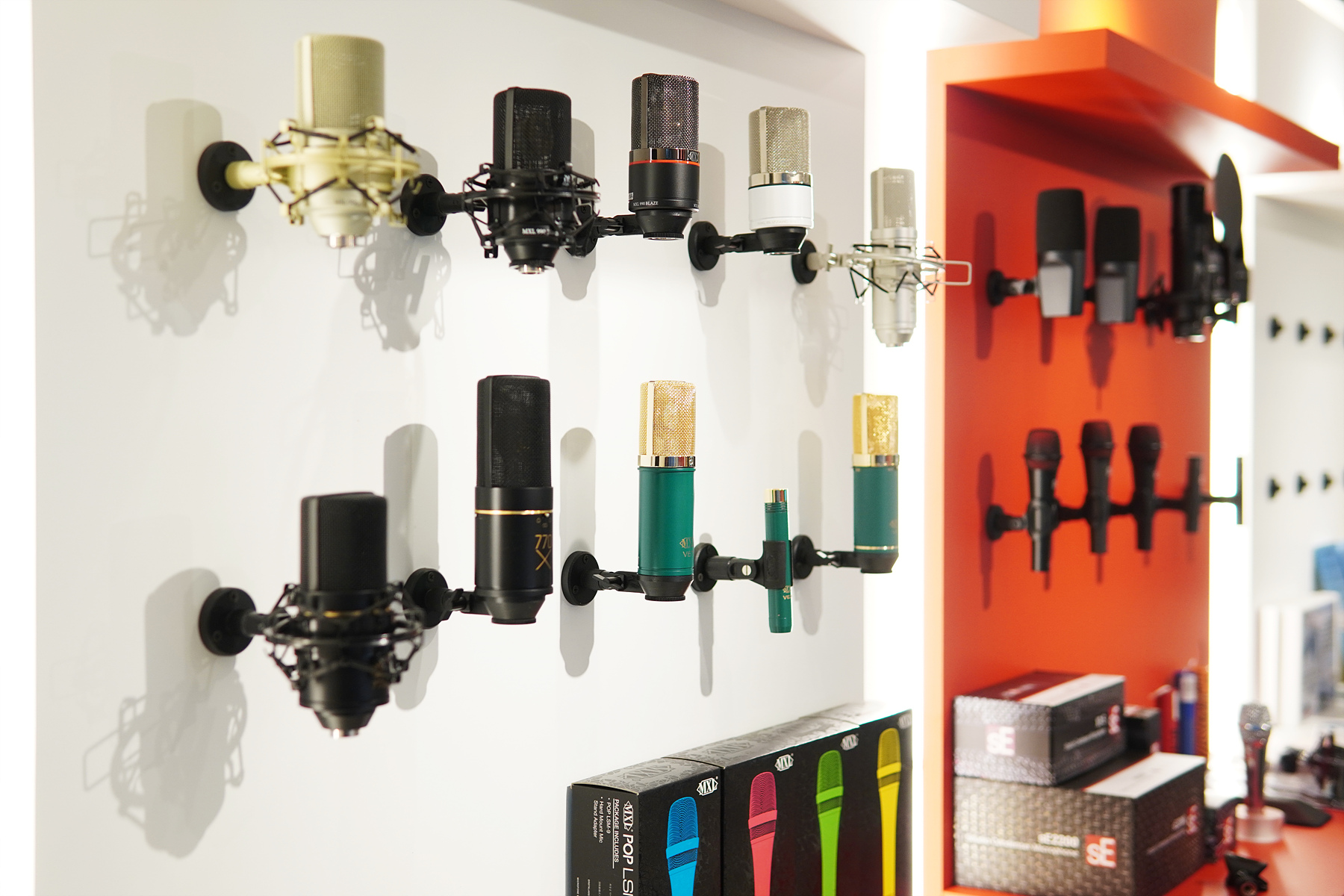 그동안 인터넷이나 유튜브 리뷰로만 보던 MXL, RODE, sE 브랜드의 다양한 마이크들이 모두 준비되어 있는데 초보인 저로서는 상당히 신기하고 흥미로운 경험이었습니다.