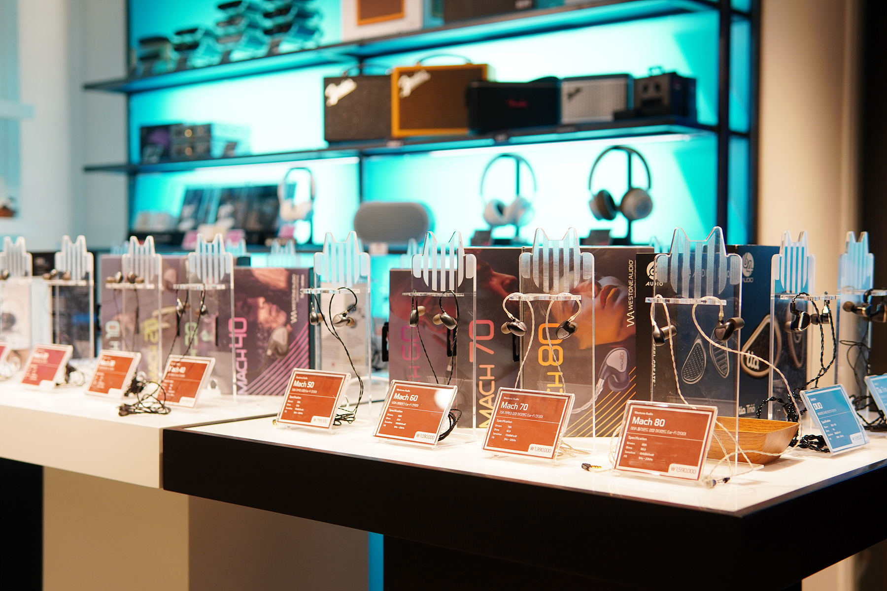 웨스턴의 마하(Mach) 제품들이 모두 진열되어 있는데 이어폰을 좋아하는 분들이라면 절대 그냥 지나칠 수 없는 공간이겠죠. W40 이어폰을 2년 정도 사용하고 있는데 마하 40이나 그 이상의 라인업들은 어떤 소리나 특성을 가지고 있을지 정말 궁금하네요. 이날은 시간 여유가 없어서 눈으로만 감상을 하려는 목적이라 이어폰 역시 따로 청음을 하지는 않았습니다. (다음번에는 DAP를 꼭 가져가야겠습니다.)