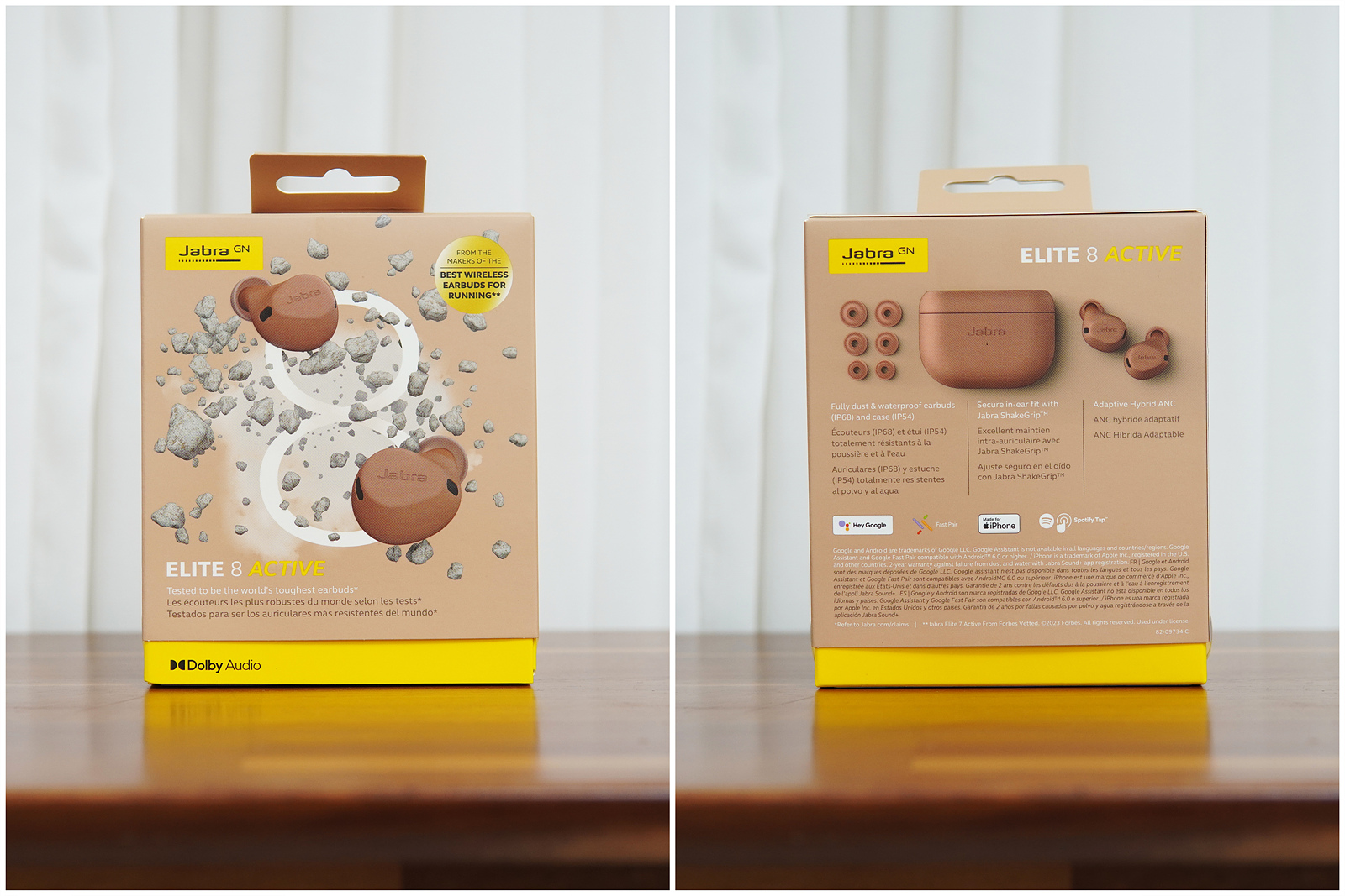 박스에는 제품의 특징이 잘 표시되어 있고 제품의 색과 박스가 같은 콘셉트로 되어있네요. 엘리트 8 액티브는 블랙 / 네이비 / 다크그레이 / 카라멜 4가지가 있는데 이전 제품들의 경우 화이트나 아이보리 계열의 밝은 색이 있었는데 이번에는 짙은 색으로만 출시되었네요.