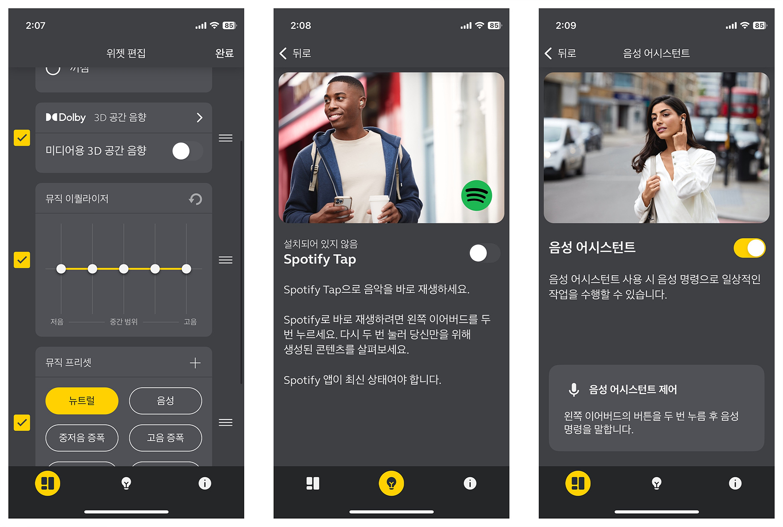 착용 센서가 있어서 이어버드를 벗을 때 재생을 일시 멈추는 기능과 마이크의 음소거뿐 아니라 위젯 편집과 음성 어시스턴트등 꽤나 많은 부가 기능을 사용할 수 있습니다.