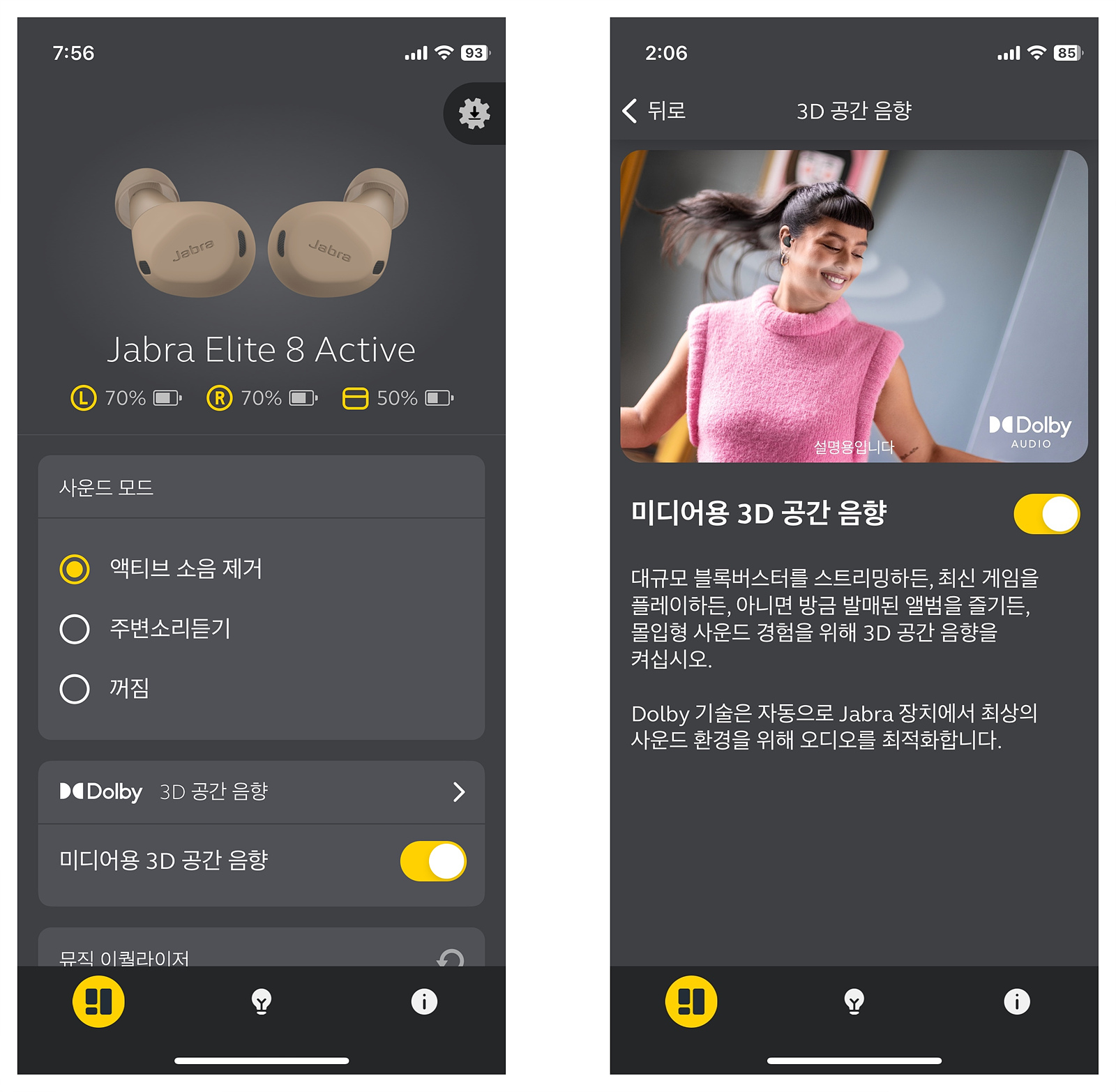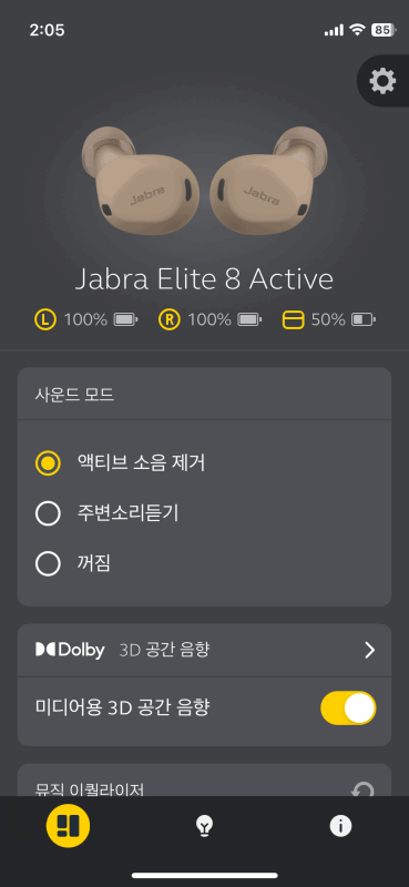 Elite 8 Active는 돌비 사운드를 사용할 수 있는데 헤드 트래킹 기능은 빠지고 공간 음향만 적용이 되었습니다. 개인적으로는 넷플리스와 같은 영상에서도 크게 체감이 되지는 않았습니다. (헤드 트래킹 부분이 빠져서 그런 거 같습니다.) 음악을 들을 때는 공간 음향은 끄고 사용하는 걸 추천합니다. 음상이 뒤로 맺히는데 이 거리감이 꽤 큰 편이라 소리가 불분명해지면서 많이 탁해지는 느낌이었습니다.