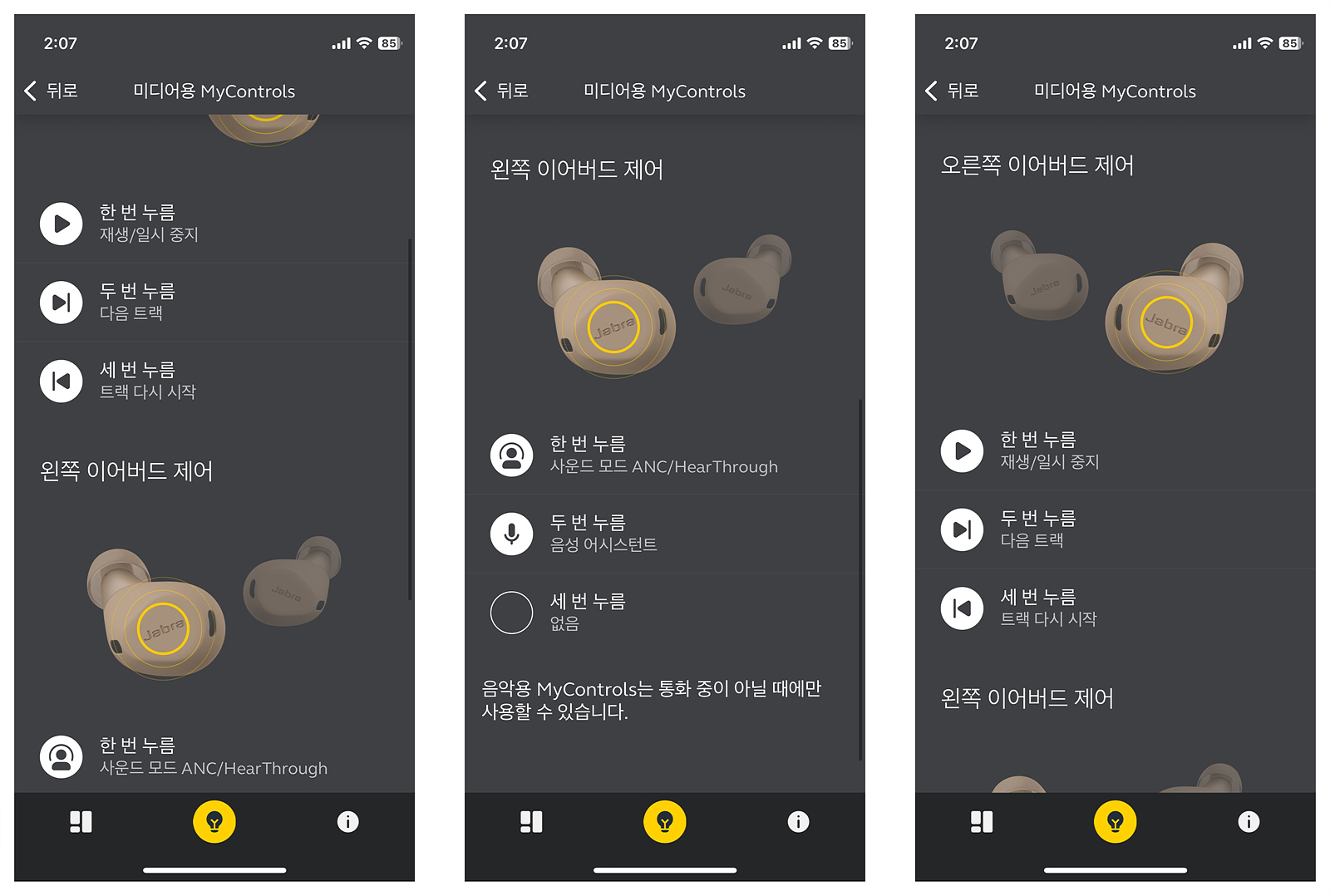 이어버드는 터치가 아닌 물리버튼이며 좌우가 다르게 동작합니다. 이어버드의 기능은 3, 5, 8 모두 같으며 자브라 전용 앱을 사용하면 재생이나 통화기능 모두 사용자가 임의로 바꿀 수 있습니다.