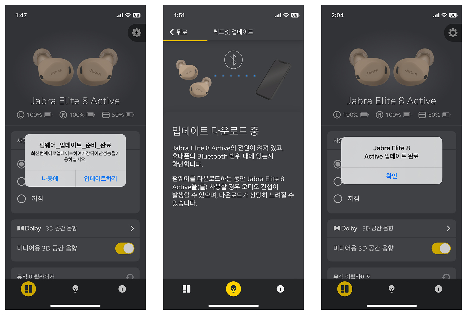 QR코드의 안내에 따라 전용 앱(Jabra Sound+)을 설치하고 실행하면 자동으로 펌웨어 업데이트 안내가 팝업이 됩니다. 설치는 10분 내외로 그리 오래 걸리지는 않았습니다.