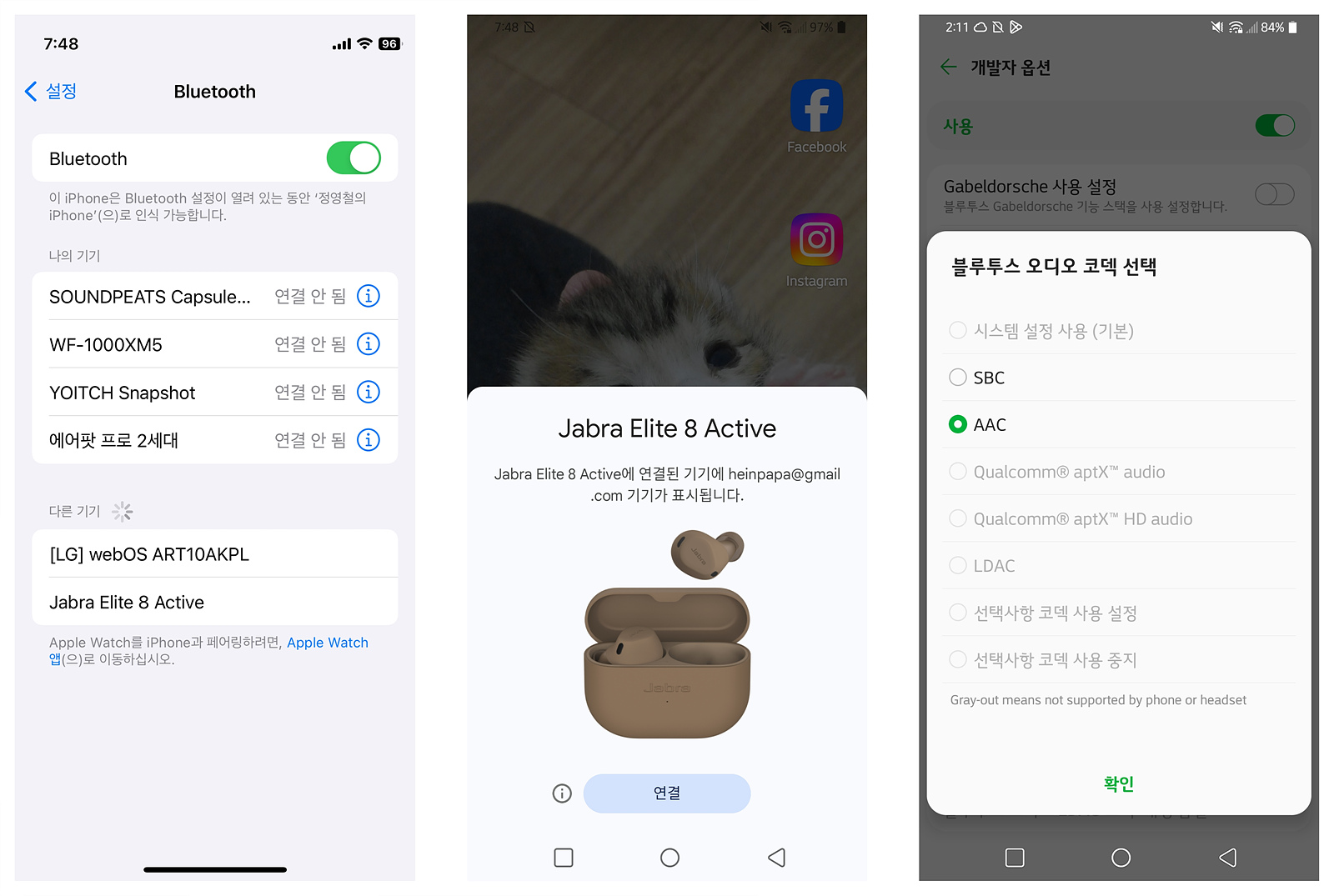 IOS에서는 기기를 검색해서 페어링 할 수 있으며 안드로이드에서는 패스트 페어링으로 쉽고 빠르게 기기를 등록할 수 있습니다. Jabra Elite 8 Active는 SBC, AAC 코덱을 사용하며 스펙에 표시된 LC3+ 코덱은 추후 펌웨어 업데이트를 통해 지원이 된다고 합니다.