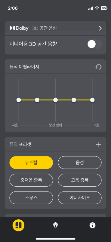 6개의 프리셋과 함께 5 밴드를 조절해서 사용자 EQ를 만들어서 사용할 수 있습니다. 개인적으로 프리셋 적용보다는 뉴트럴 모드나 사용자 EQ를 사용하는 걸 추천합니다.
