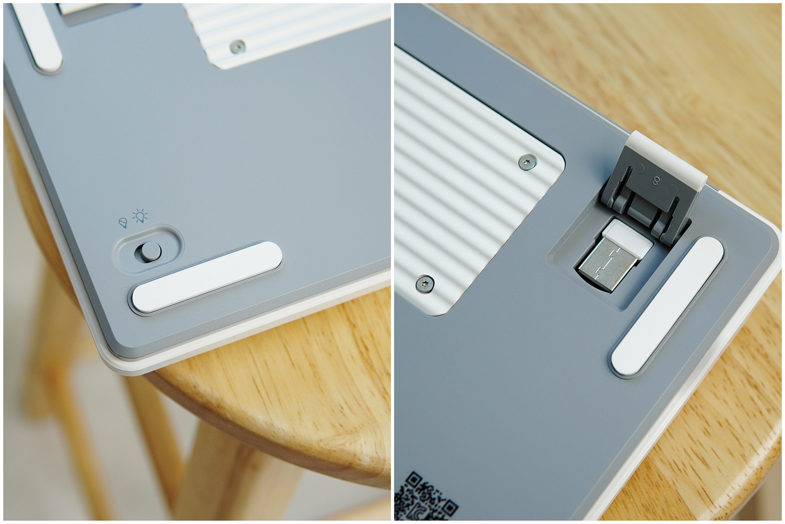 바닥에는 LED를 켜고 끌 수 있는 스위치가 있으며 전용 수신기는 높이 조절용 다리 아래에 수납되어 있습니다. 조절용 다리가 커버 역할도 하고 있어서 안심하고 키보드를 가지고 다닐 수 있겠네요.