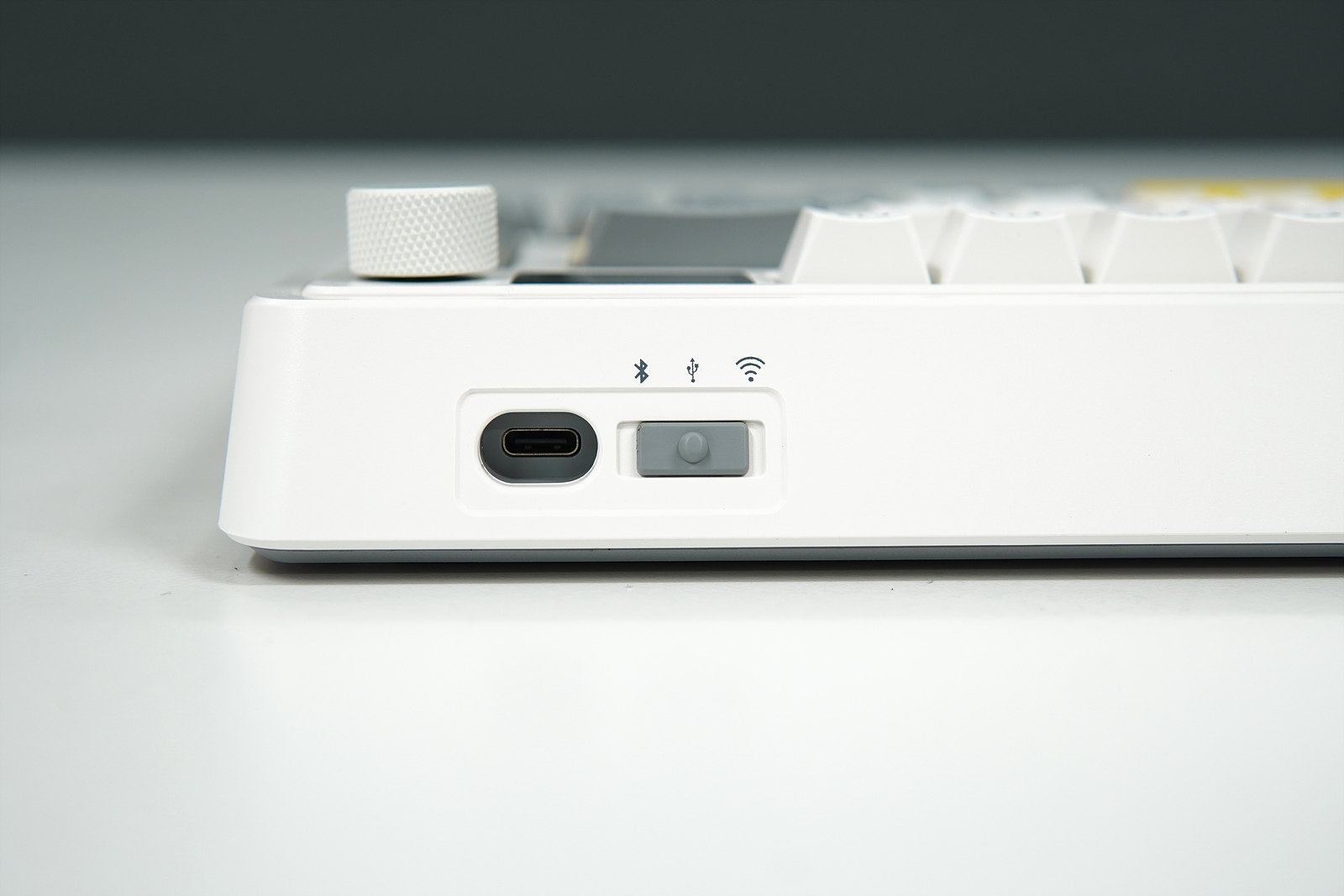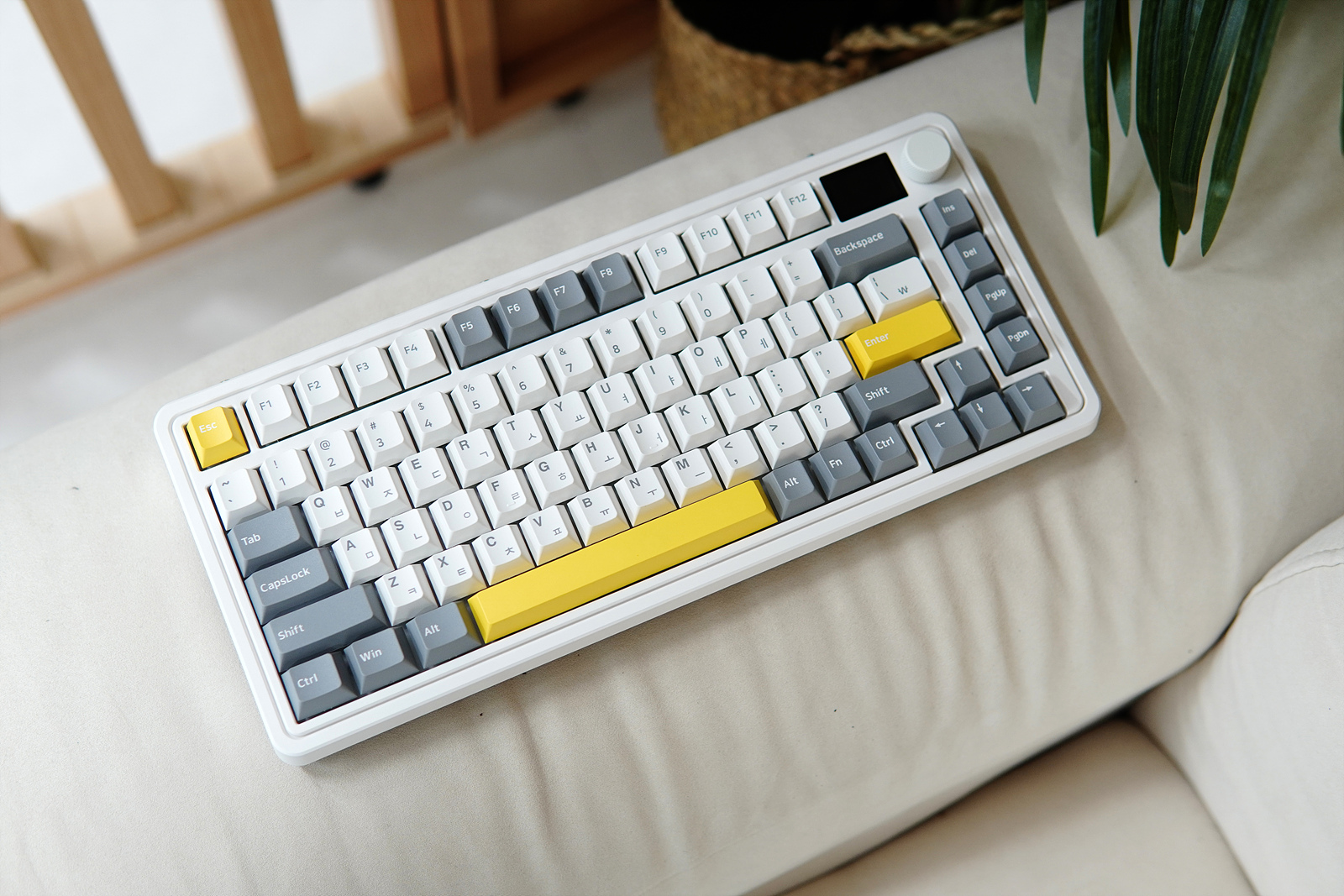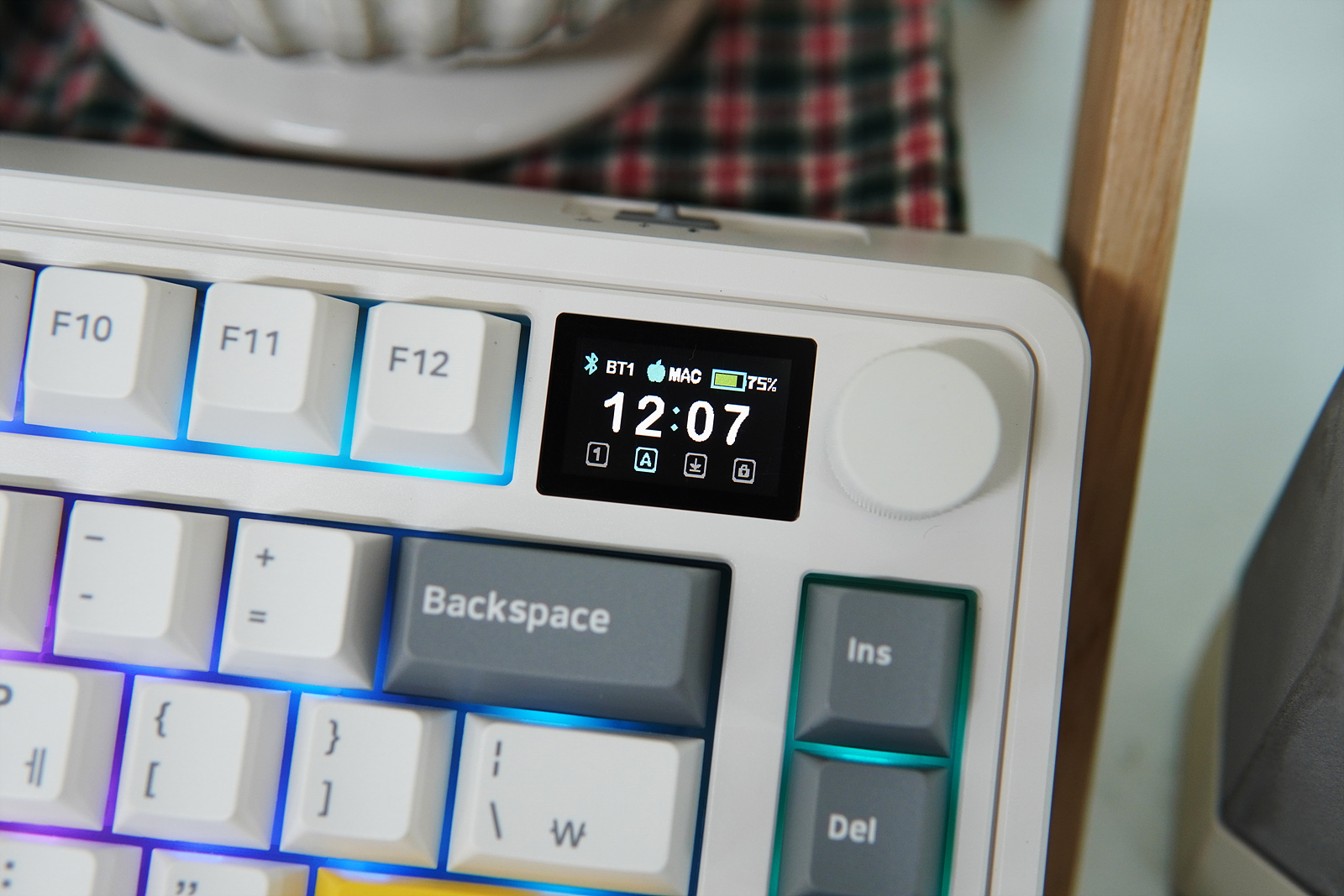 CMK75는 챠콜 그레이 / 발렌타인 핑크 / 화이트 그레이 세 가지 색이 있으며 제가 소개하는 제품은 화이트 그레이입니다. 일반적인 풀 사이즈나 텐키리스보다 더 작은 75% 크기의 81 Key 배열이라 사용자마다 호불호가 나뉠 수 있습니다. 오른쪽에는 1.17인치의 LCD 화면서 조절 노브가 있어서 다른 키보드와는 크게 다른 모습을 하고 있습니다.