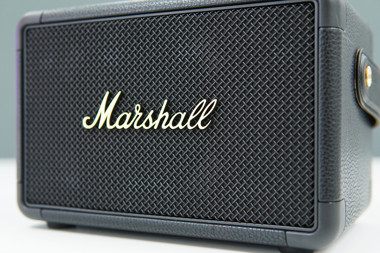 앞쪽에는 특유의 감성을 자랑하는 마샬(Marshall) 로고가 있고 별도의 손잡이가 달려있어서 스피커를 이동할 때 편리하게 사용할 수 있습니다. 킬번2는 Black, Black & Brass 두 가지 색이 있으며 소개하는 제품은 Black & Brass입니다. 블랙 색상은 마샬 로고가 흰색으로 되어있으며 전체적으로 조금 더 빈티지한 느낌이라 마샬 앰프 느낌을 좋아한다면 Black으로 선택하시고 좀 더 깔끔한 느낌을 좋아한다면 Black & Brass를 추천합니다.