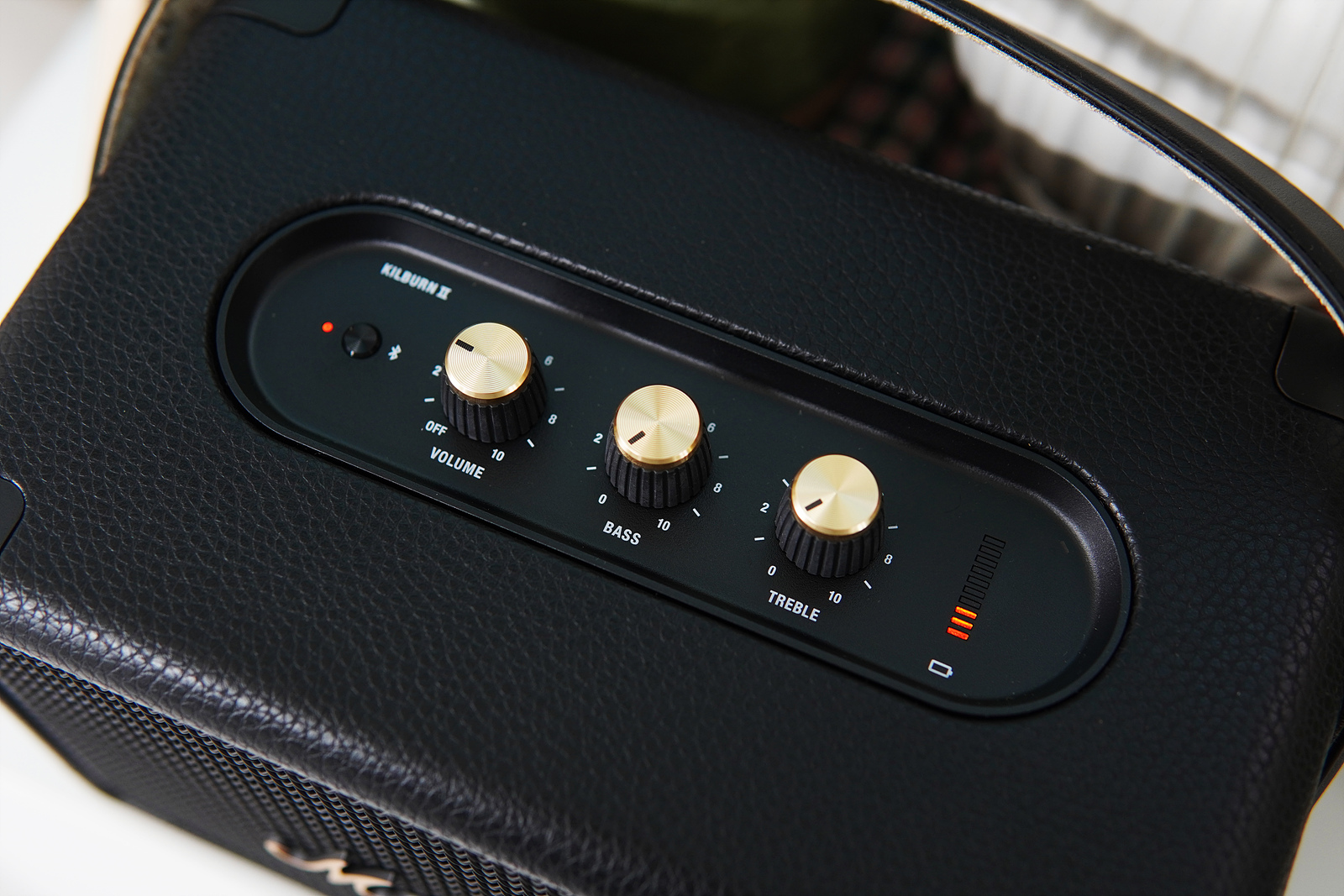 왼쪽부터 블루투스 페어링 버튼, 전원 & 볼륨, Bass, Treble 조절 노브 그리고 배터리 상태를 확인할 수 있는 LED가 있습니다. LED 표시는 10단계로 현재 배터리 상태를 한눈에 알아볼 수 있는 직관적인 형태로 되어있어서 마음에 들었지만 전원을 별도의 버튼이 아닌 볼륨 조절 노브와 같이 사용하는 건 아쉽더군요. 기능뿐만이 아닌 디자인으로서도 모두 다 마이너스라 기타 앰프의 느낌을 기대했던 분들에게는 더더욱 아쉬울 수 있는 부분입니다.