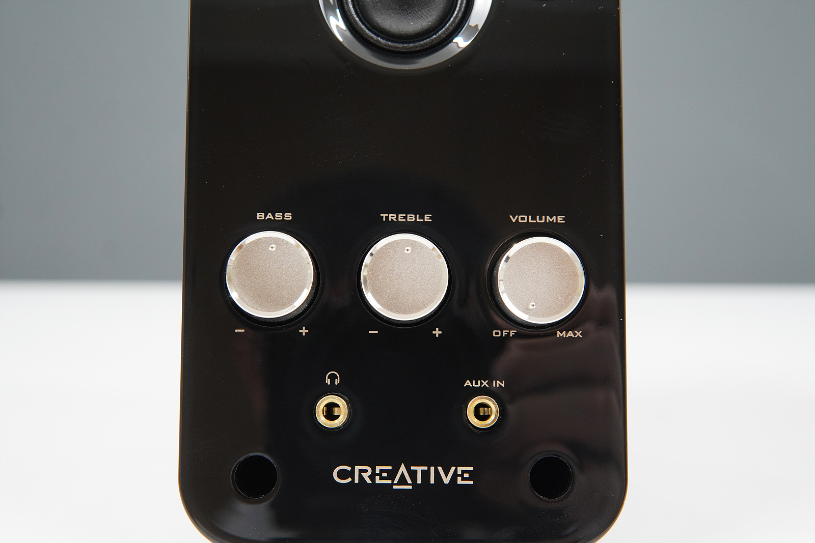 오른쪽 액티브 스피커에는 저음 / 고음 / 볼륨을 조절할 수 있는 3개의 노브가 있는데 별도의 전원 버튼 없이 볼륨 노브로 전원을 On/Off 할 수 있습니다. 조절 노브 아래쪽으로 3.5mm 입출력 단자가 각각 배치되어 있습니다.