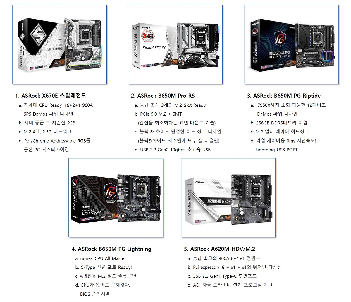 이번 서포터즈 활동 인원은 총 5명으로 각각 다른 제품으로 ASRock 메인보드의 활용을 소개하게 됩니다. 자료에서도 알 수 있지만 빵빵하고 든든한 전원부는 ASRock 메인보드의 특징이자 장점 중 하나입니다.