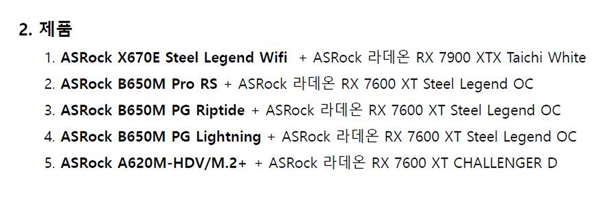 메인보드와 VGA가 같이 제공되어 여러 가지 테스트와 활용을 할 수 있으며 라이젠 & 라데온의 조합인 라라랜드로 시스템을 구성할 수 있습니다. (ASRock 그래픽카드는 라데온만 있습니다.) 제공되는 제품 중에서도 특히나 라데온 RX 7600 XT는 며칠 전 1/24일 엠바고가 풀렸으며 아직 정식 판매가 되지 않은 완전 따끈따끈한 신상입니다.