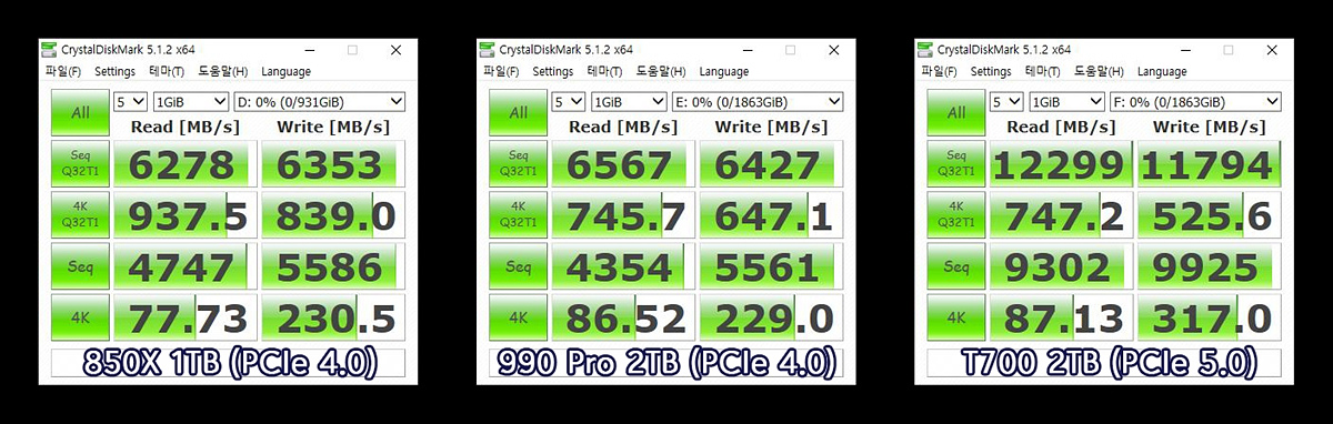 1번 슬롯에는 PCI 5.0을 지원하는 마이크론 T700을 장착하였으며