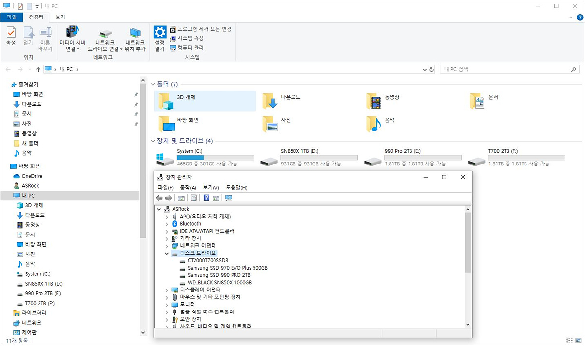 방열판이 없는 2번 슬롯에는 OS용으로 970 Evo를 장착하였고 기다란 방열판을 공유하는 3번과 4번 모두 PCIe 4.0을 지원하는 850X 1TB, 990 Pro 2TB SSD를 장착하였습니다.