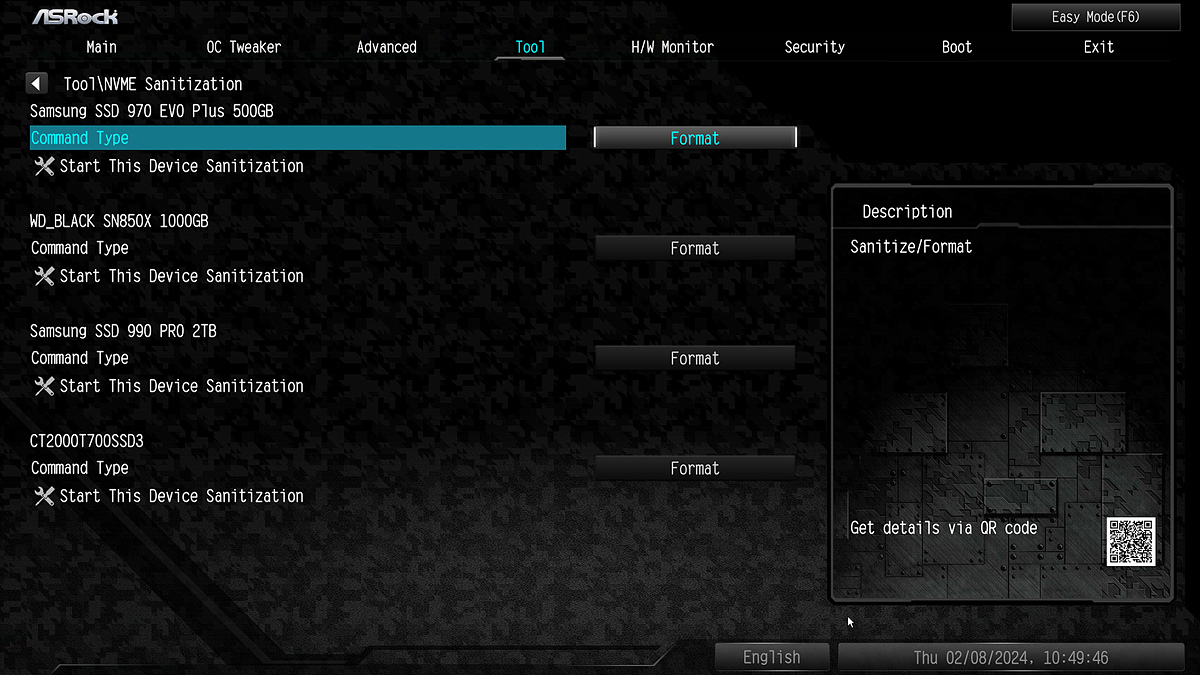 바이오스에서 저장 장치들을 확인할 수 있으며 부팅하지 않고도 자체적으로 포맷을 할 수 있습니다.