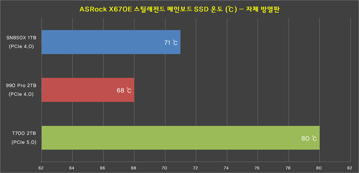 1번 슬롯의 방열판이 좀 큰 편임에도 PCIe 5.0의 빠른 속도 때문에 온도는 제법 높더군요. 방열판 자체의 온도도 꽤 높아서 3초 이상 손을 대고 있기 힘들정도로 뜨거운 편이었습니다. 1번 슬롯의 쿨링은 방열판만 있는 패시브 방식보다는 작게나마 쿨러가 추가된 액티브 쿨링 방식이 더 효과적일 거라 생각됩니다. 다음번에는 ASRock SSD 쿨러와 메인보드의 방열판 사용에 따른 온도는 얼마나 달라지는지 테스트해보겠습니다.