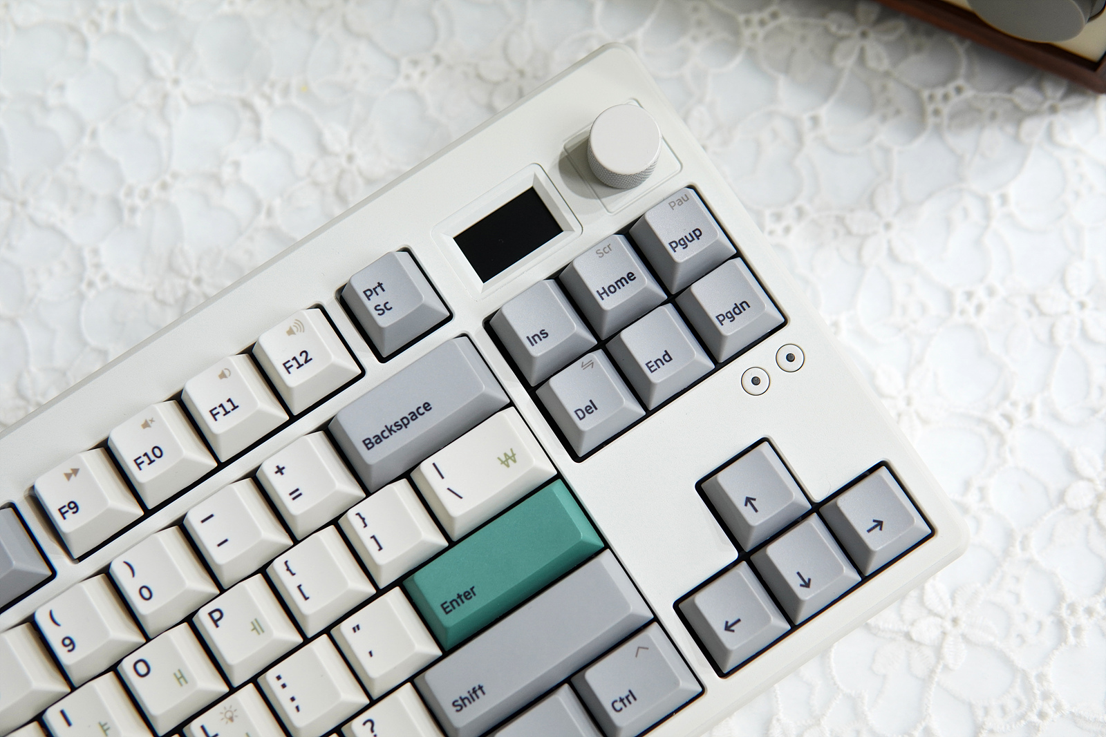 일반적인 텐키리스라고 한다면 87key 배열을 생각하지만 GS85는 제품 이름에서 알 수 있듯이 87이 아닌 85개의 키를 가지고 있으며 디자인도 조금은 다르게 되어 있습니다. Print Screen / Scroll Lock / Pause Break 3개의 키 중에서 Prt Sc만 그대로 두었고 옆쪽으로 스마트 스크린과 조절 노브(Knob)를 배치한 조금은 색다른 디자인으로 평소 거의 사용되지 않는 Scr / Pau 두 개의 키는 Fn 키와의 조합으로 사용할 수 있습니다.