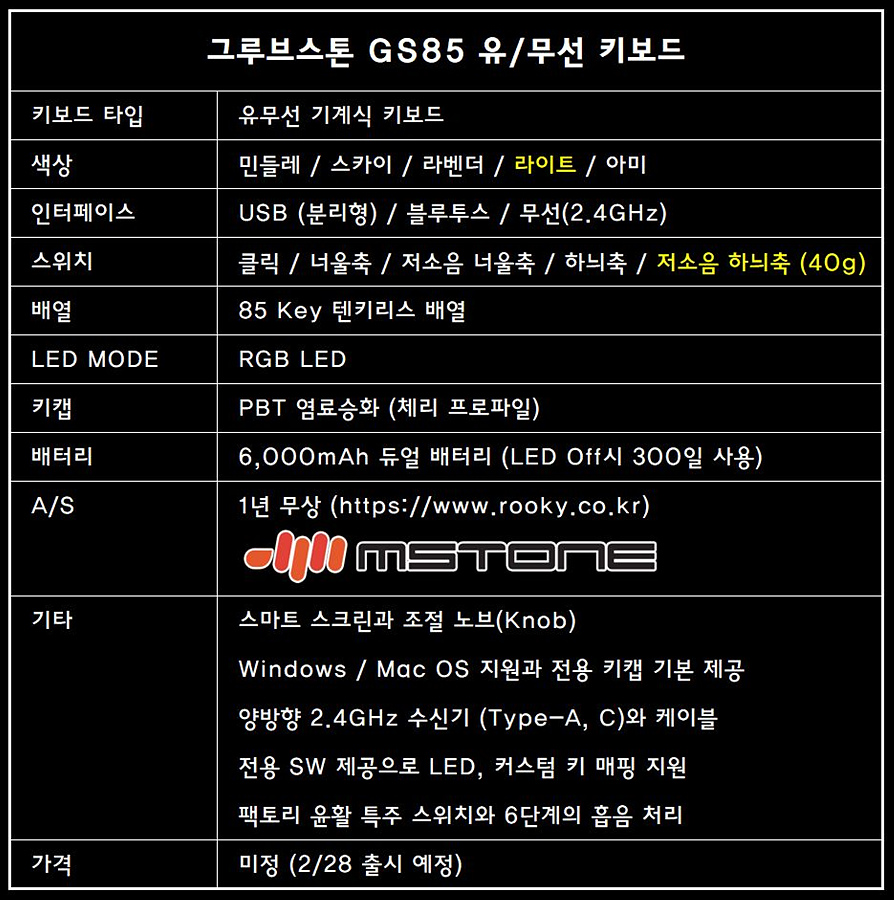 이렇듯 키보드 춘추전국시대를 맞이하여 정숙한 타건감으로는 어디에서도 빠지지 않는 엠스톤(그루브스톤)에서도 새로운 GS 라인업 제품들로 출사표를 던졌습니다. GS(Groove Standard) 라인업은 엠스톤에서 꽤 오랜 시간 동안 공을 들여 자체 개발한 제품으로 사용자들의 요구가 많았던 유선 & 무선이 결합된 유무선 키보드이며 풀배열(GS104), 텐키리스(GS85), 숫자 패드(GS20) 3가지 배열로 출시가 됩니다.