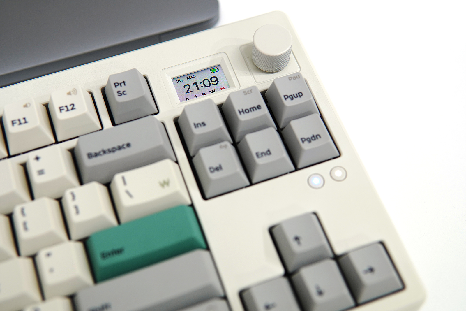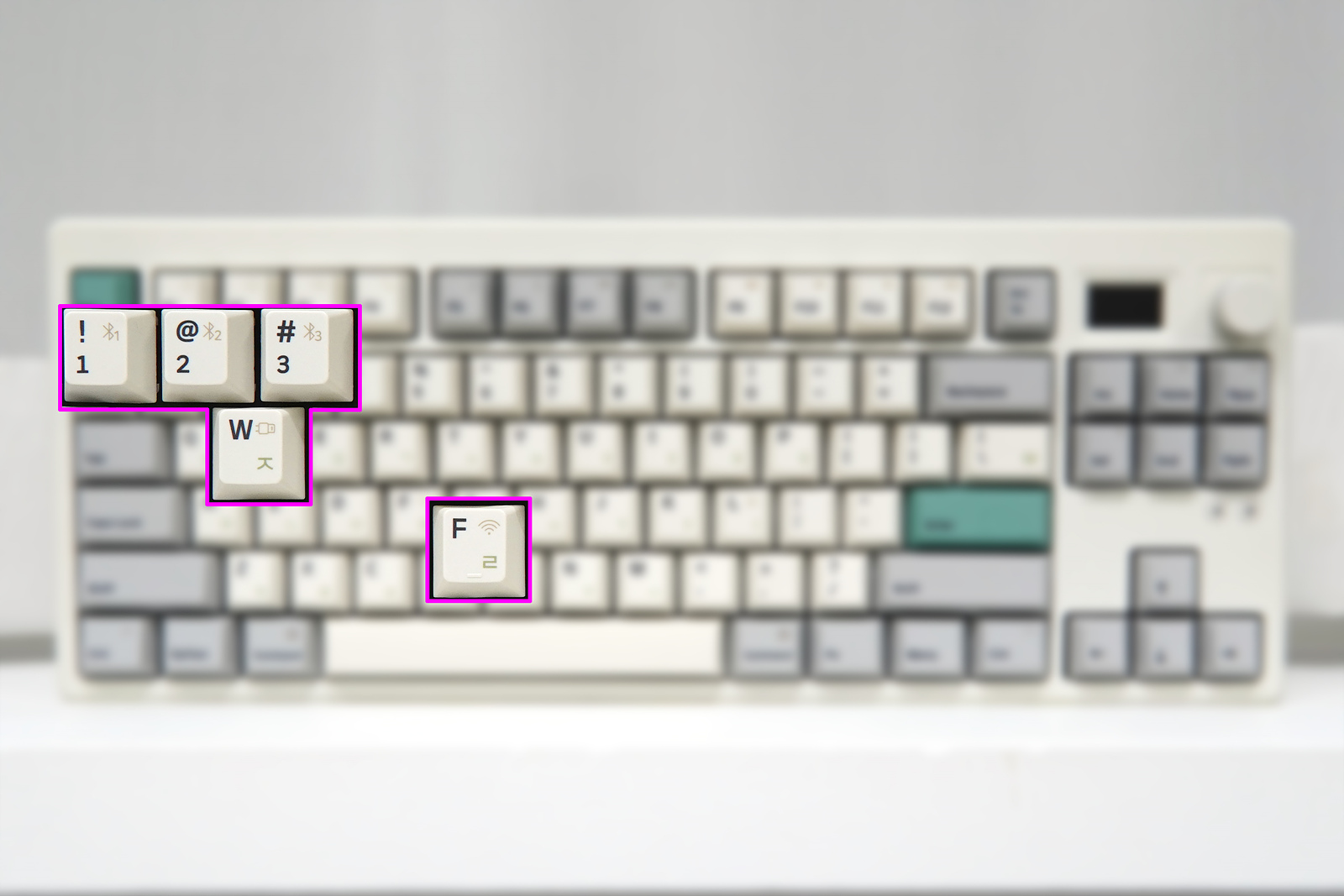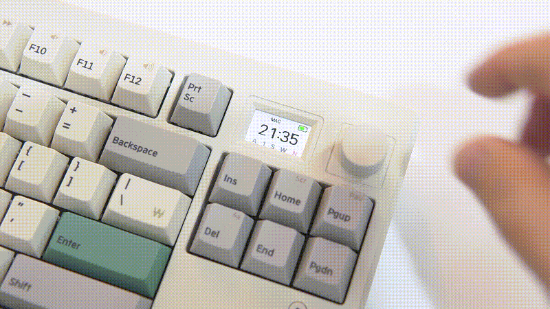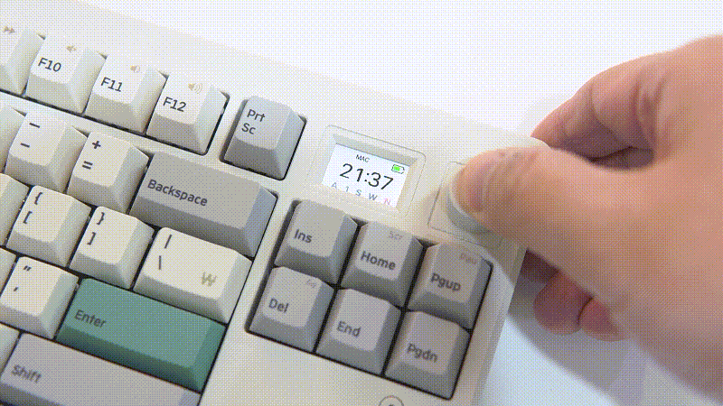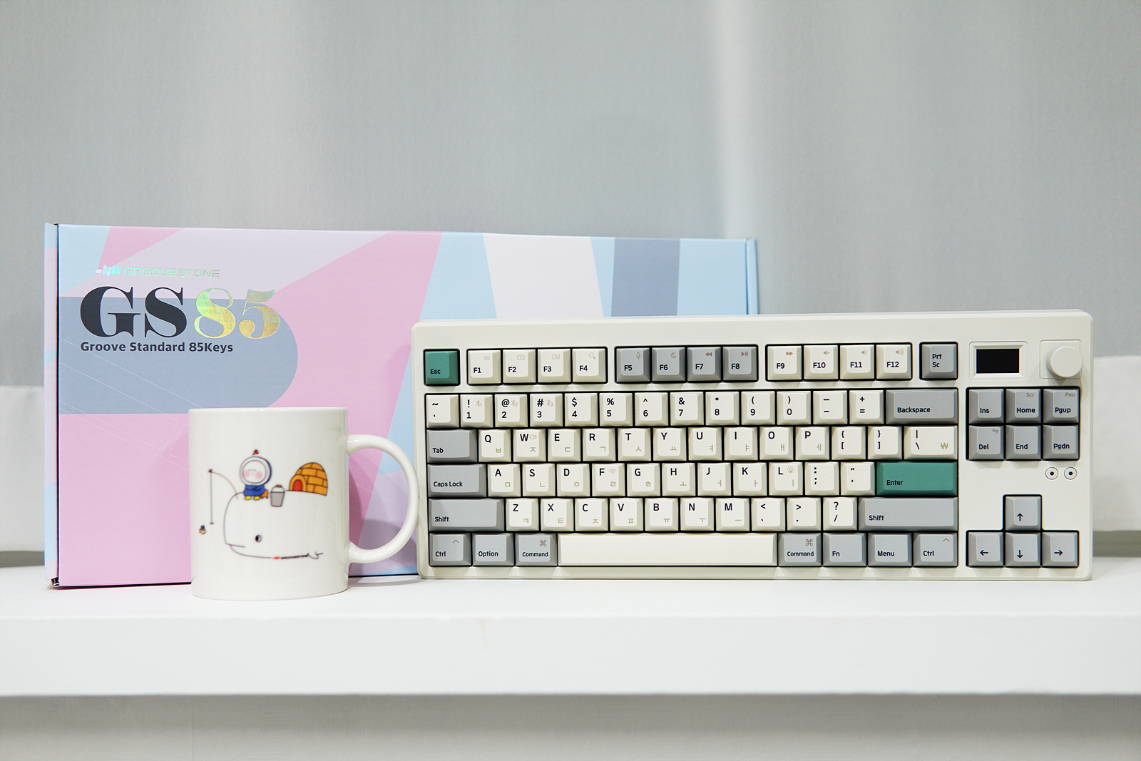 일반적인 텐키리스라고 한다면 87key 배열을 생각하지만 GS85는 제품 이름에서 알 수 있듯이 87이 아닌 85개의 키를 가지고 있으며 디자인도 조금은 다르게 되어 있습니다. Print Screen / Scroll Lock / Pause Break 3개의 키 중에서 Prt Sc만 그대로 두었고 옆쪽으로 스마트 스크린과 조절 노브(Knob)를 배치한 조금은 색다른 디자인으로 평소 거의 사용되지 않는 Scr / Pau 두 개의 키는 Fn 키와의 조합으로 사용할 수 있습니다.