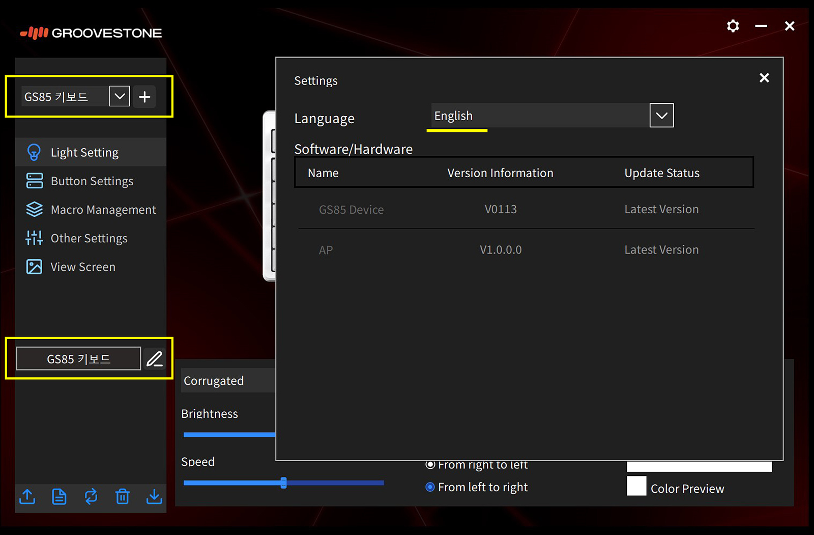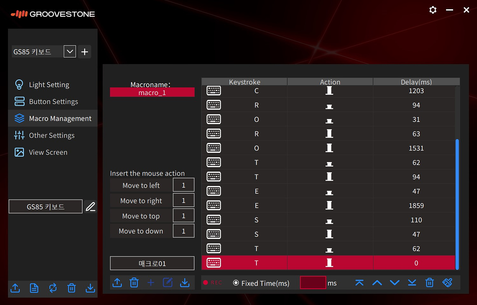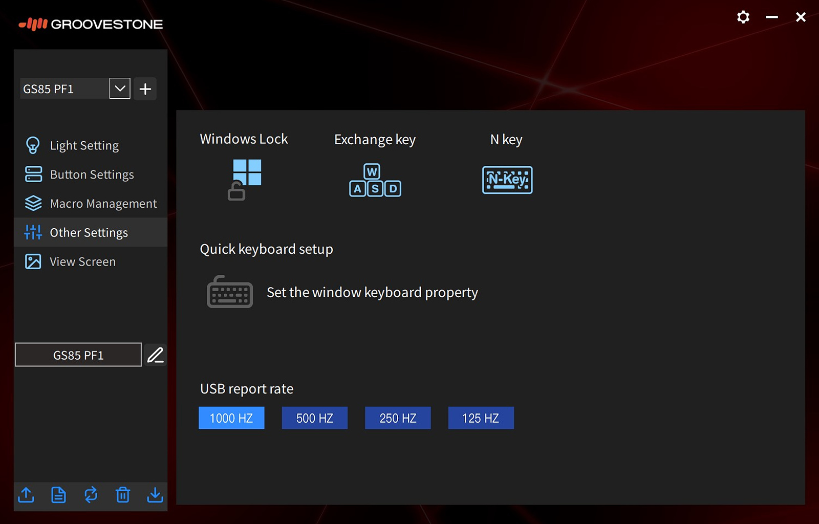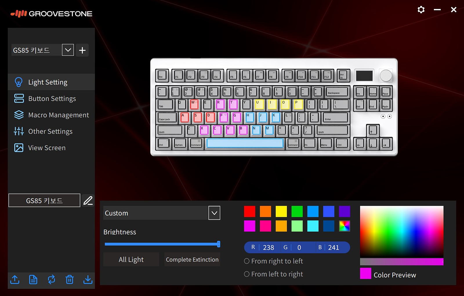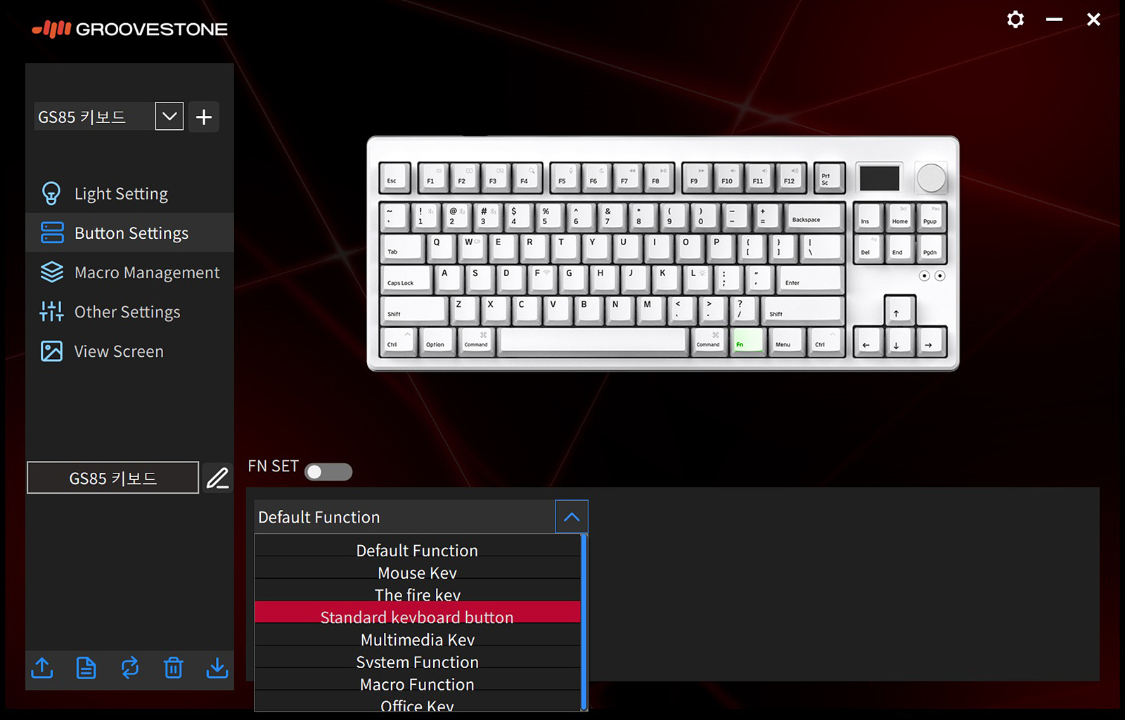 왼쪽으로 5개의 메뉴로 GS85의 기능을 사용할 수 있습니다. GS104 / GS85 키보드에 따라 소프트웨어가 각각 따로 있기 때문에 사용하는 키보드에 맞게 설치하시기 바랍니다.