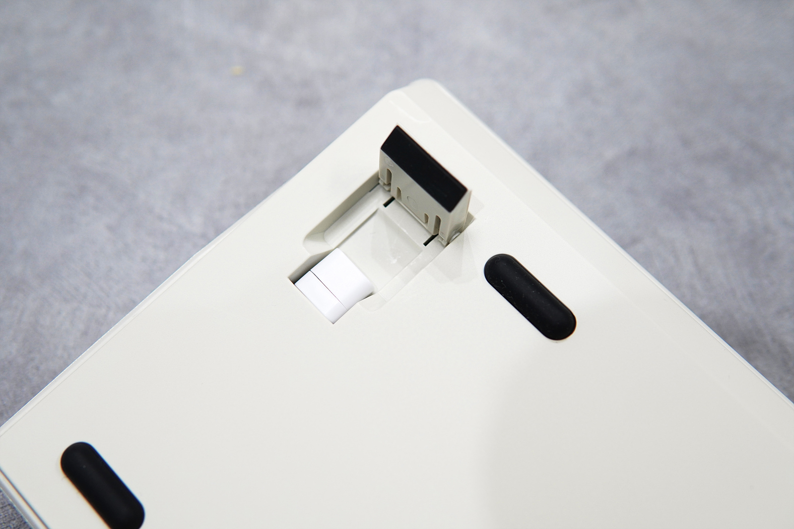 GS85는 유선(USB), 블루투스와 함께 2.4GHz 무선을 지원하는데 기본 구성품에 보이질 않아서 조금 이상하게 생각했는데 이렇게 키보드 아래쪽에 따로 보관이 되어 있었네요. 무선 수신기(동글)를 수납하는 공간에는 자석이 있어서 손쉽게 부착할 수 있으며 케이블과 마찬가지로 수신기 뒤쪽의 커버를 열면 Type-C 커넥터가 있어서 USB 커넥터(A, C)를 가리지 않고 모두 사용할 수 있습니다. 핵심 기능이라고 할 수는 없지만 이런 작은 배려나 부가 기능 하나가 사용자의 만족도를 크게 올려주는 부분이라고 생각합니다. (아주 칭찬해주고 싶습니다.)