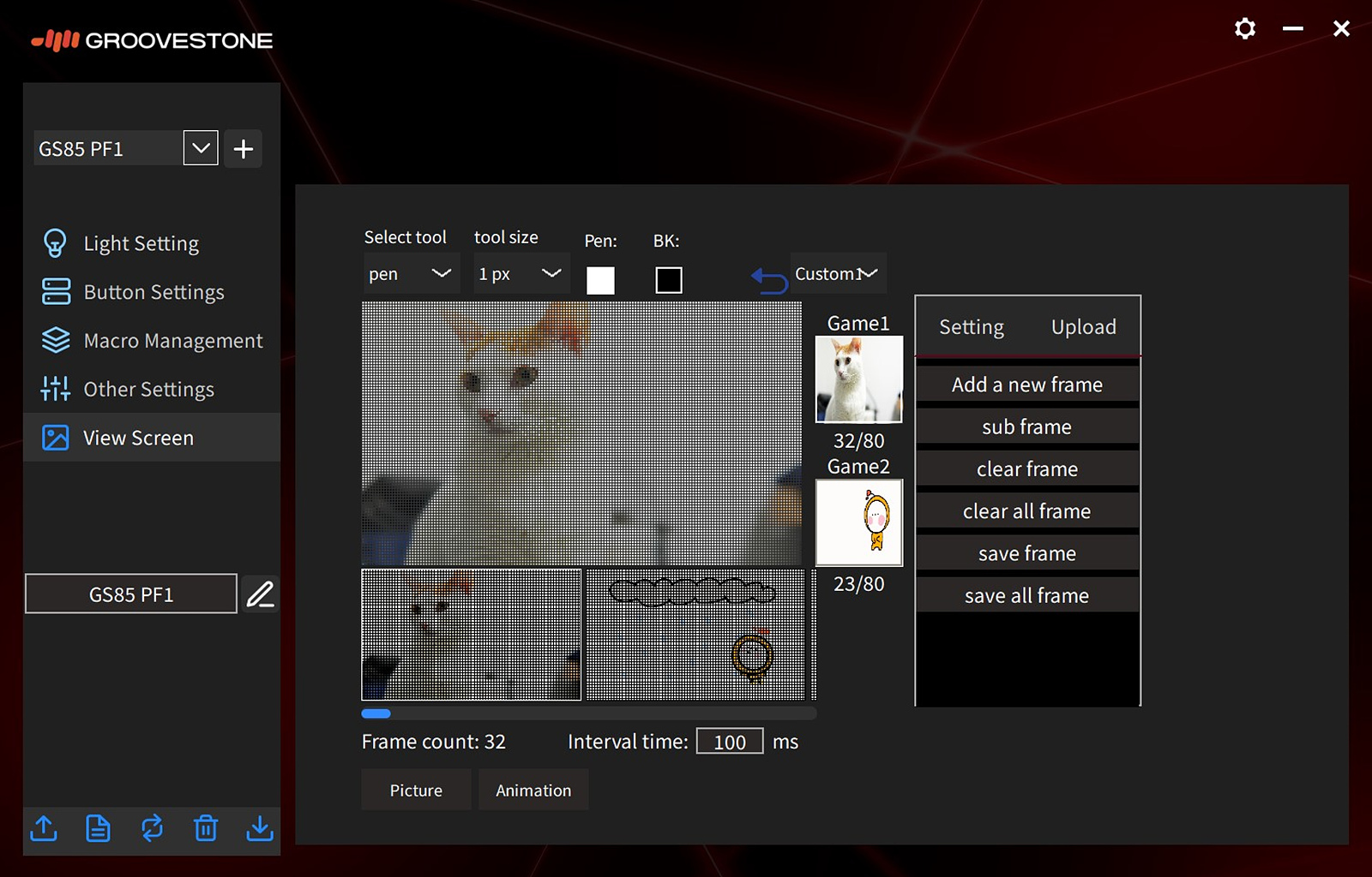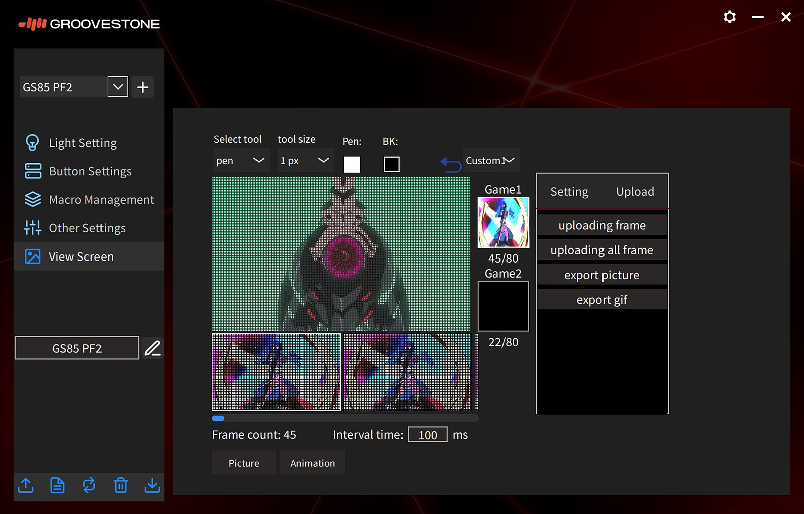 스마트 스크린의 사진이나 GIF를 사용자가 원하는 화면으로 따로 업로드할 수 있고 픽셀 단위로 색을 변경할 수도 있습니다. 사용자가 원하는 사진으로 교체할 수 있는 부분은 상당히 만족스러운 부분이지만 키보드에 인식(업로드)하기까지 시간이 오래 걸리는 편이라 좀 아쉽더군요. 이런 부분을 업그레이드하려면 MCU나 처리 장치 쪽의 스펙이 좋아야 하는데 이럴 경우 아무래도 제품의 단가는 조금 더 올라가겠죠.