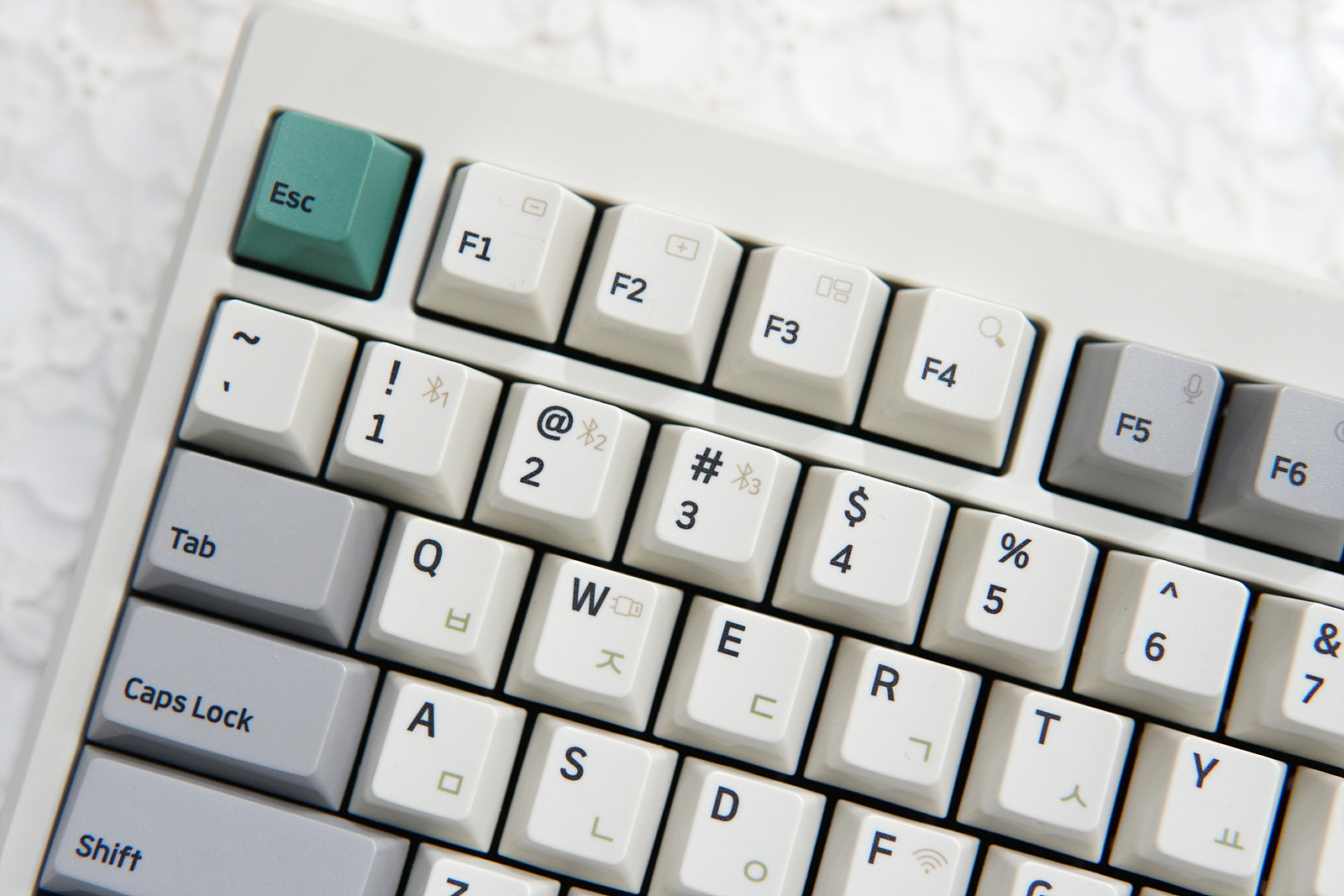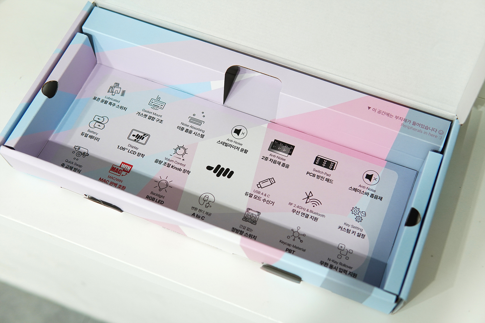 키캡에는 맥에서 사용되는 기능키들이나 연결, 블루투스, LED 변경가지 모두 각인이 되어 있습니다. 중국에서 직구로 구입하는 제품들과의 차이점이라면 한글 각인인데 키보드를 좋아하는 분들이라면 한글이 없어도 괜찮을 수 있지만 이제 입문하려는 분들에게는 큰 걸림돌이 되는 부분이죠.