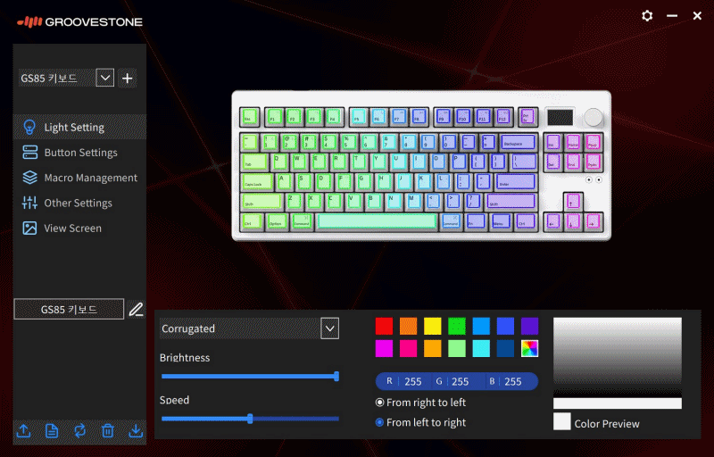 GS 시리즈에서 새롭게 추가된 부분인 전용 S/W입니다. 두 개의 프로파일을 사용할 수 있으며 LED, 키 매핑과 스마트 스크린의 화면을 사용자가 원하는 대로 조절할 수 있습니다. 초기 버전이라서 그런지 한글이 아닌 영어로 사용을 해야 합니다. 사용방법은 쉽고 간단하지만 그래도 업그레이드를 통해 한글이 지원되길 바랍니다.