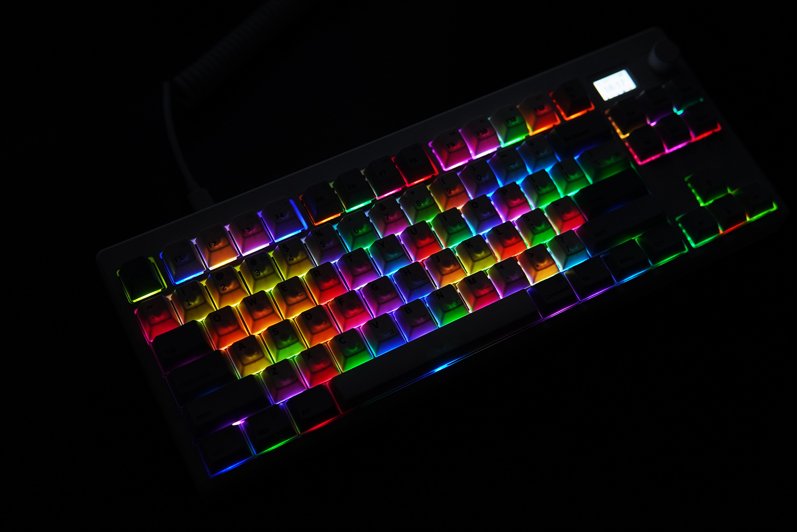 투명한 이중사출 키캡이 아닌 염료승화 방식이라 RGB 뿜뿜까지는 아니었지만 20개가 넘는 모드와 이 정도의 밝기라면 LED가 부족하다고 생각되지는 않았습니다. (전 화이트 단색 LED를 가장 좋아합니다.)