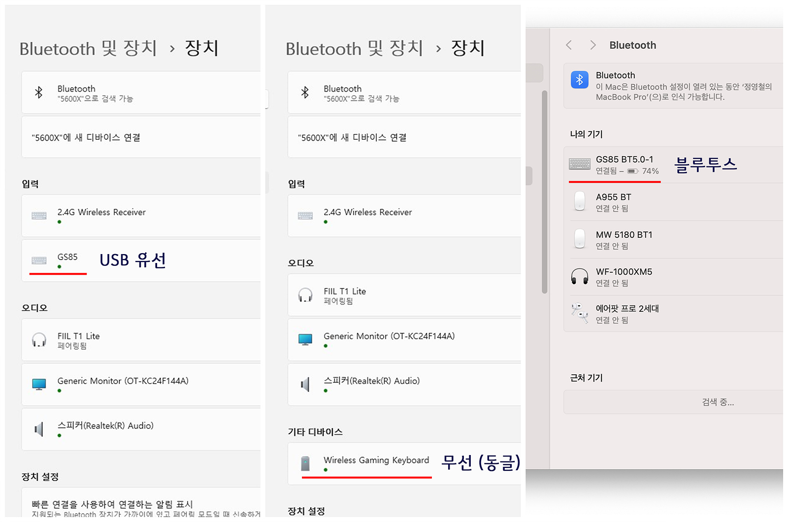 Fn + W, F = 유선(USB), 무선(전용 수신기) 모드 변경
