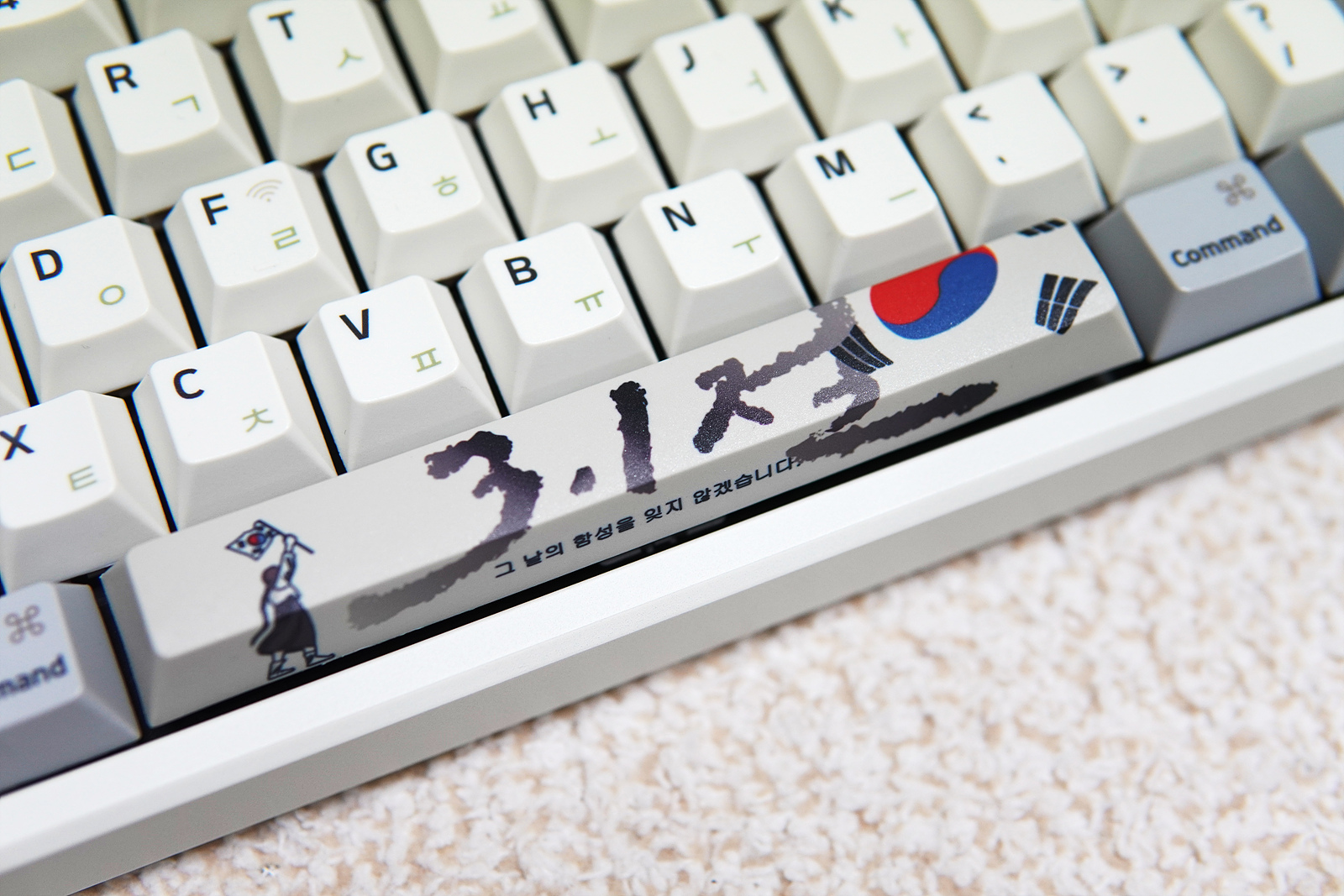 개인적으로 그루브스톤(엠스톤)을 좋아하는 이유 중 하나가 바로 이런 포인트 키캡입니다. 내일모레면 3.1절이라 꼭 소개를 하고 싶어서 촬영했습니다. 3.1절 키캡 말고도 윤봉길 의사나 한글 전용 키캡등 뜻깊은 내용의 포인트 키캡을 이렇게 꾸준하게 만드는 업체는 국내에 유일하다고 알고 있습니다. (판매가 아닌 무료로 배포합니다.)